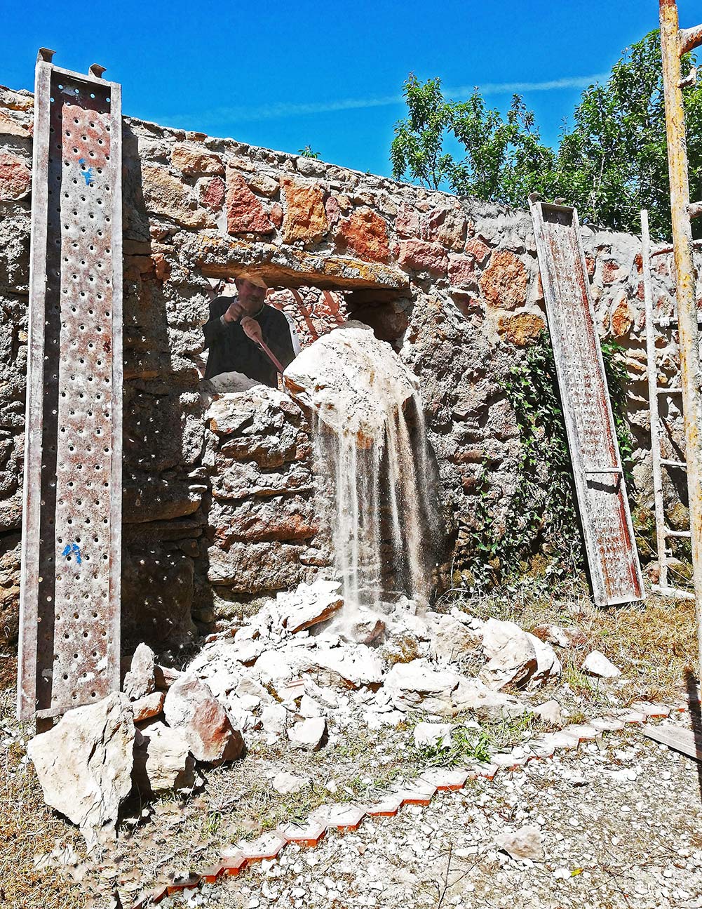 De muren van het oude huis laten zich lezen als een overzicht van de geschiedenis. Volgens José Luis is het huis al verschrikkelijk oud. Hij ziet het aan de hoge raampjes die eruitzien als schietgaten van een middeleeuws kasteel, van binnen breed en van buiten smal, alsof er geschoten moest worden op vijanden. Er zijn in Portugal in de loop an de eeuwen heel wat schermutselingen geweest. De Portugese families onderling, met de Spanjaarden, met de Moren. Als José Louis gelijk heeft dateert het huis uit de middeleeuwen, je zou het kunnen betwijfelen, maar hij vertelt dat toen het land bewoond werd de vulkanische stenen die overal lagen met de hand verzameld zijn en gebruikt om huizen te bouwen en ook het land bewerkbaar te maken. De muren zelf vertellen ook hun verhaal. Je kunt zien aan de lijnen die in de muren lopen dat het huis een stuk kleiner is geweest, dat er een stal aan heeft gezeten die later overdekt werd, verhoogd en bij het huis getrokken. Je kunt gaten zien waar balken in hebben gezeten voor een vloer zodat er een soort zoldertje is geweest. Aan de lateien en de stapeling van stenen kun je zien dat er een deur is geweest en een raam. Je kunt zien dat het dak een keer verhoogd is, misschien wel gelijk met het aanleggen van de vloer voor de zolder. Eén van de ramen wordt in ere hersteld. De stenen waarmee het raam is dichtgemaakt worden eruit gebikt, die verzamelen we om lege plekken aan de buitenmuur weer op te vullen. Er is een grote steen van misschien wel tachtig kilo die er niet uit te tillen is. Die moest met een koevoet van zijn plaats gewrikt worden. We konden hem wel met een steekkarretje veiligstellen voor later gebruik.