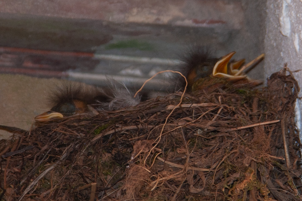 Het nest waar we eergisteren over schreven, heeft jongen. Minstens drie, en misschien wel vier of vijf. De moeder heeft het wel weer pal onder de pannen gebouwd en het is te hopen dat het niet te heet wordt. Waarschijnlijk zijn de jongen nog maar net uit het ei, gisteren was er nog niets te zien, ze maken ook nu nog geen geluid en de oogjes zitten nog dicht. De moeder of de vader vliegt af en aan om ze te voeden, maar ze durft niet zo goed als wij erbij staan te koekeloeren om een foto te kunnen maken. We laten ze daarom maar met rust. Niet dat we nu de schuur mijden, als we spullen nodig hebben dan pakken we die, maar we blijven niet lang staan te kijken. Ze moet tussen de bedrijven door de rust vinden om de kleintjes te voeren.