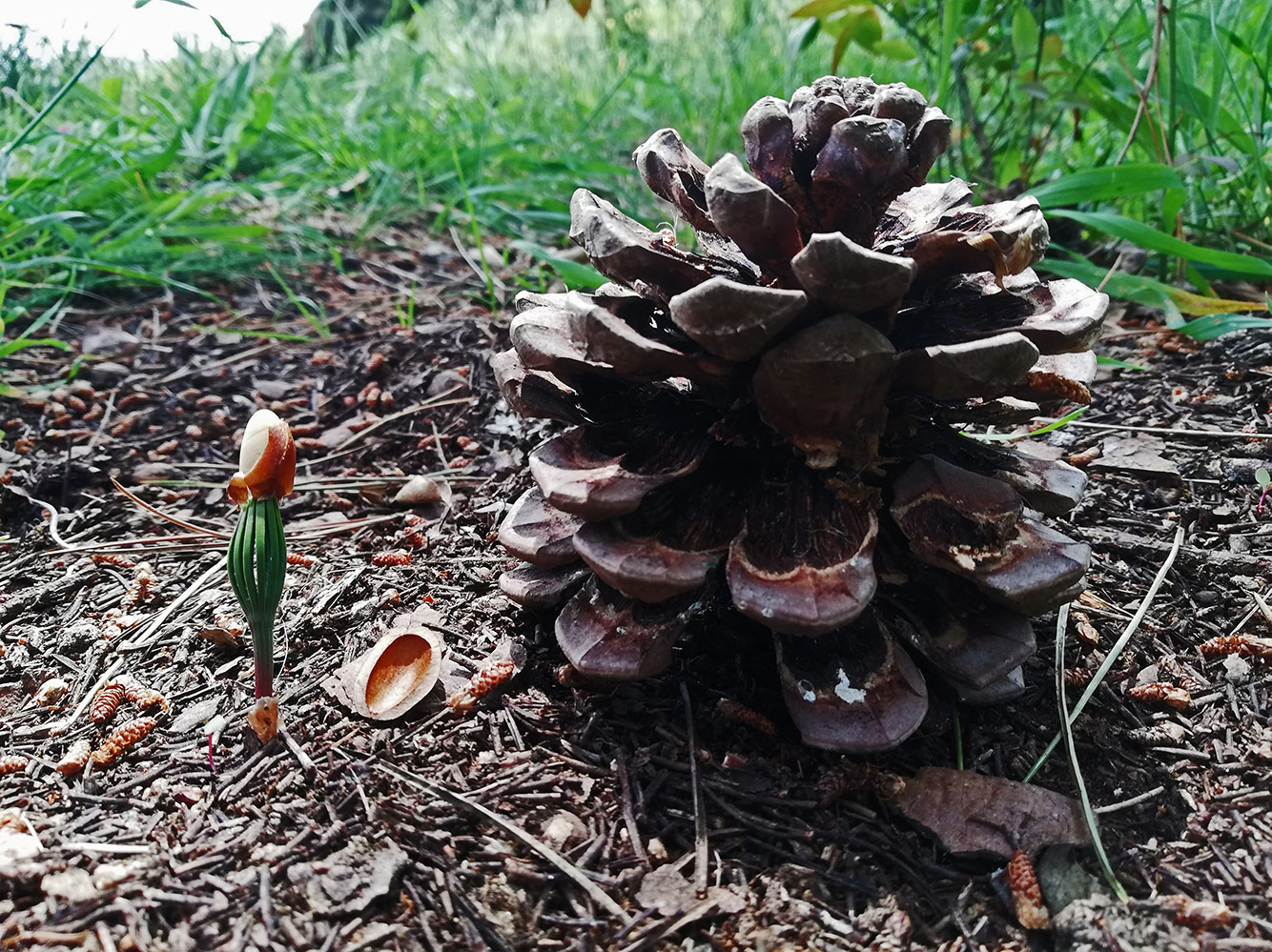 Op het terrein staan een aantal pijnbomen. De dennenappels vallen overal op de grond rondom de boom. De eekhoorns, die we nooit zien, maar die er wel altijd zijn, pulken ze open. We vinden de afgekloven resultaten hier en daar. Af en toe vinden we ook een hoop pijnboompitten, waarschijnlijk is dan een eekhoorn gestoord in zijn bezigheden of de honden hebben er een helemaal afgekloven.