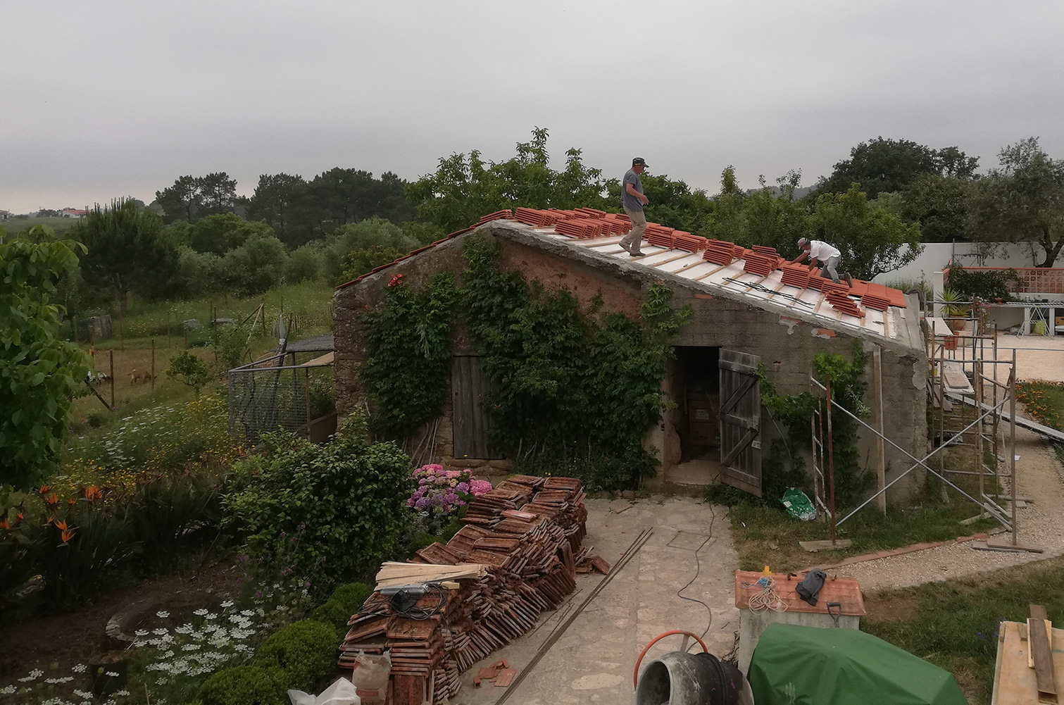 Het schiet lekker op, het dak zit er bijna op. De pannen liggen er bijna allemaal op. Met zijn drieën zijn de mannen bezig, de een sjouwt, de ander legt klaar en de volgende legt ze neer. Het is niet zomaar linksboven beginnen en rechtsonder eindigen. Er wordt veel met touwtjes gewerkt om lijnen uit te zetten opdat de pannen netjes onder en naast elkaar komen te liggen. De laatste en de eerste pannen van de helft van de rijen steken uit, de pannen liggen in verband en kennelijk worden de eerste en laatste later bijgesneden. De laatste en eerste rij worden nog niet gelegd waarschijnlijk omdat de betonnen rand van de latei later nog bekleed moet worden. Het is wel een vreemd gezicht, zo’n oud huis met een gloednieuw dak, maar het wordt wel erg mooi. Als het dak eenmaal klaar is wordt het tijd om eens na te gaan denken hoe het binnen allemaal moet gaan worden. Uiteindelijk is het de bedoeling er een volwaardig (vakantie-) huis van te maken, daarvoor moet nog een hoop gebeuren, maar het is in ieder geval waterdicht!