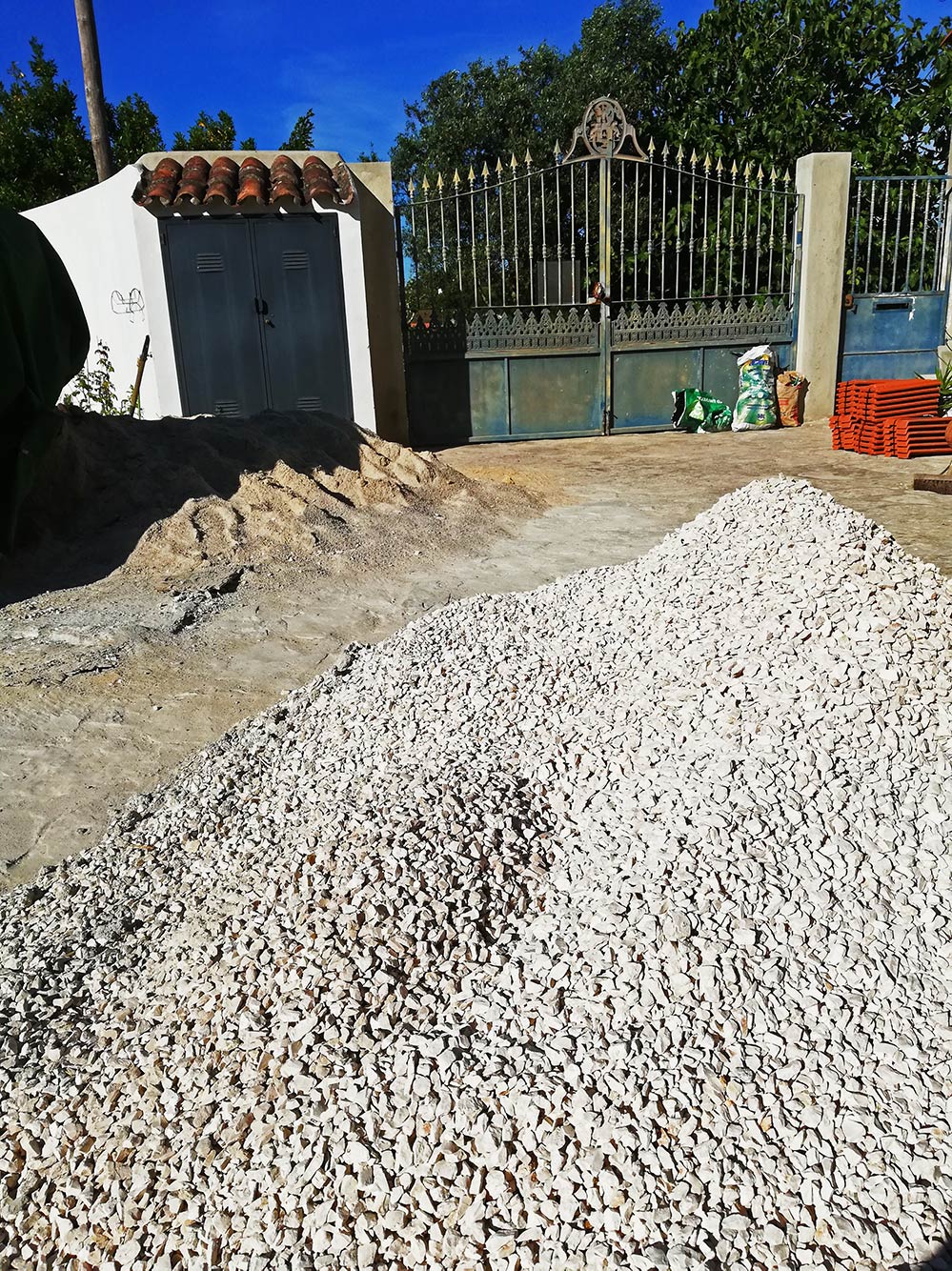 De mannen zijn weg. Het werk is gedaan, voor hun dan. Het grote opruimen is begonnen. De mannen werken netjes en voor ze weggaan wordt de boel nog even opgeruimd. Maar er valt wel eens een scherfje van een dakpan en er valt wel eens een klodder cement hier of daar. De scherven worden verzameld en gebruikt om een pad aan te leggen. Het hout wordt verzameld om nog een keer te barbecueën of gewoon als er een stukje hout nodig ik voor wat dan ook. We blijven zitten met bergen grind en zand. Dat is ook wel een rode draad. Wie er ook komt, er wordt veel te veel zand of grind besteld en als het werk gedaan is blijft er een flinke berg over. De vorige was van de alpendre die al ruim een jaar oud is en daarvan hebben we de resten zand pas nog in het nog te bouwen kippenhok gestort zodat de kippen er straks een zandbad in kunnen houden. En dan hebben we nogal wat zand gebruikt voor het cement van onder meer Huibs afstapje en nog een flink aantal kleine klusje. En dan zijn er ook nog drie kruiwagens aangemaakt cement verdwenen in de zeshoekige potjes die het pad maken. Goed inschatten is kennelijk erg moeilijk met dit soort projecten.