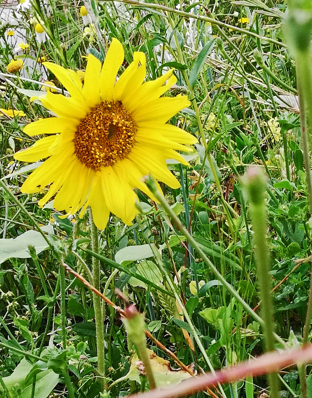 Je kunt het allemaal mooi bedenken, maar de natuur is eigenwijs. Een paar weken geleden zonnebloemzaad in bakjes gedaan, sommige komen uit, maar ze hebben veel last van de droogte. Water geven dus. Bij het kleine stukje tuin bij het hek aan de straat hebben we een paar zaadjes in de grond gezet een stuk of tien, twee zijn er op gekomen en die staan een beetje zielig te groeien. De paar in de zaaibakjes zijn uitgezet en die doen het ook schoorvoetend. De enige die het echt goed doet is degene die we niet geplant of gezaaid hebben. Die is spontaan opgekomen. Hij staat op het stukje waar het kippenhok moet komen, daar groeit en bloeit van alles. Er wordt daar geen water gegeven, niet gemaaid, niets, de natuur heeft daar vrij spel en laat zich van haar eigenwijze kant zien.