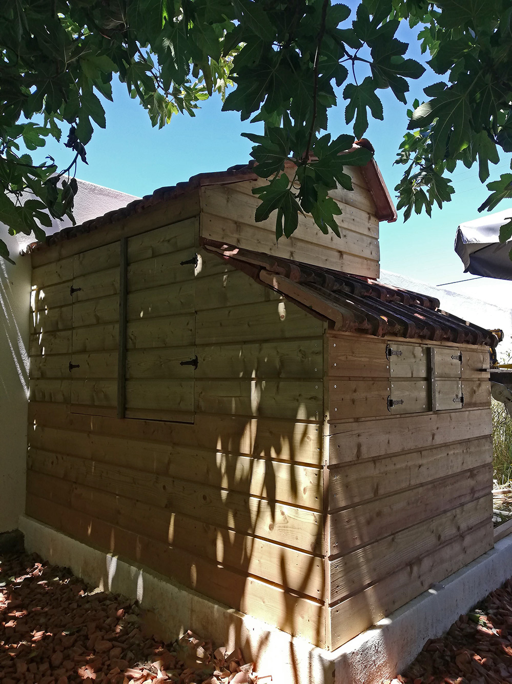 Onder het hok is een zandbak voor de kippen waar ze in kunnen wroeten en zandbaden nemen. Voorlopig is die in gebruik genomen door de katten, aan de lucht te merken.