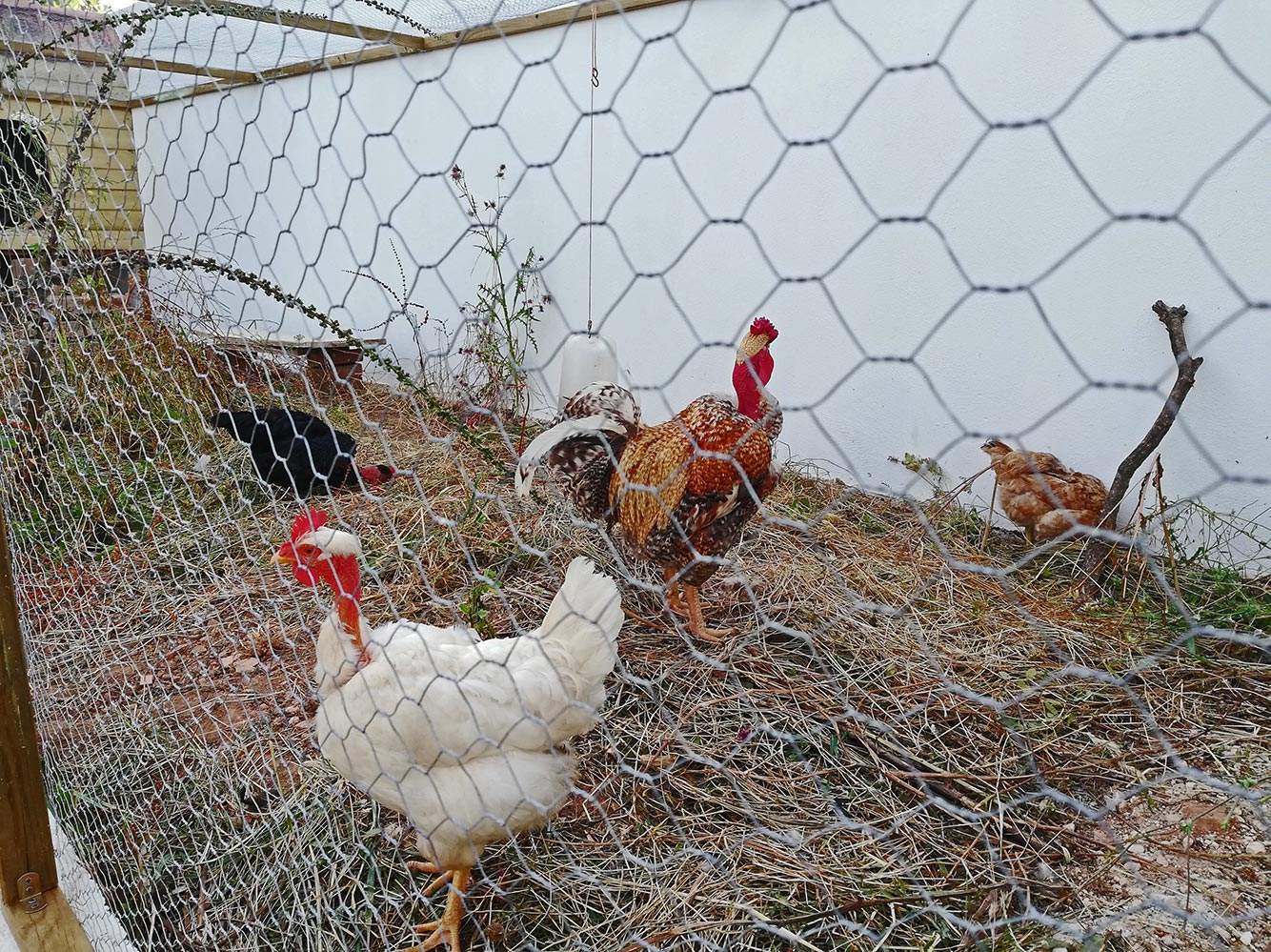 ’t Is even wennen voor ze zo achter gaas. En ’s avonds vinden ze het ook maar raar, dat ze niet meer naar hun eigen hok kunnen. Alleen Próxima gaat het nachthok in. Die zit prinsheerlijk op een van de zitstokken terwijl de andere drie een beetje schaapachtig ónder het nachthok zitten, waar we een mooie koele plek voor ze hebben, met zand om een zandbad te kunnen houden. Niet echt bedoeld voor de nacht, maar dat zal wel even wennen aan het onbekende zijn. Overdag scharrelen ze rond en zijn ze naar graantjes aan het zoeken, het ziet er alweer rustig uit. Af en toe lopen ze te drentelen langs het gaas, want ze vinden het toch wel raar dat ze er niet meer door kunnen. Een keer probeerde Mortícia eruit te vliegen, want ze zijn echt niet gewend dat er bóven hun gaas zit. Senhor Barcelos vliegt nooit, dus die heeft nergens last van.