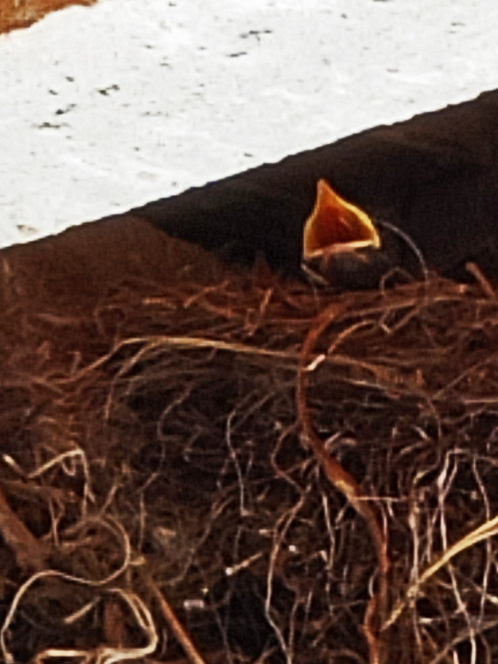 ’t Jonkie moet alweer een paar dagen oud zijn aan de snavel te zien, maar het is lastig schatten. We hebben ook het nest niet echt in de gaten gehouden, omdat we dachten dat één nestje per jaar wel genoeg is, maar ze hebben het zo naar hun zin dat ze dachten dat een tweede ook nog wel kan.