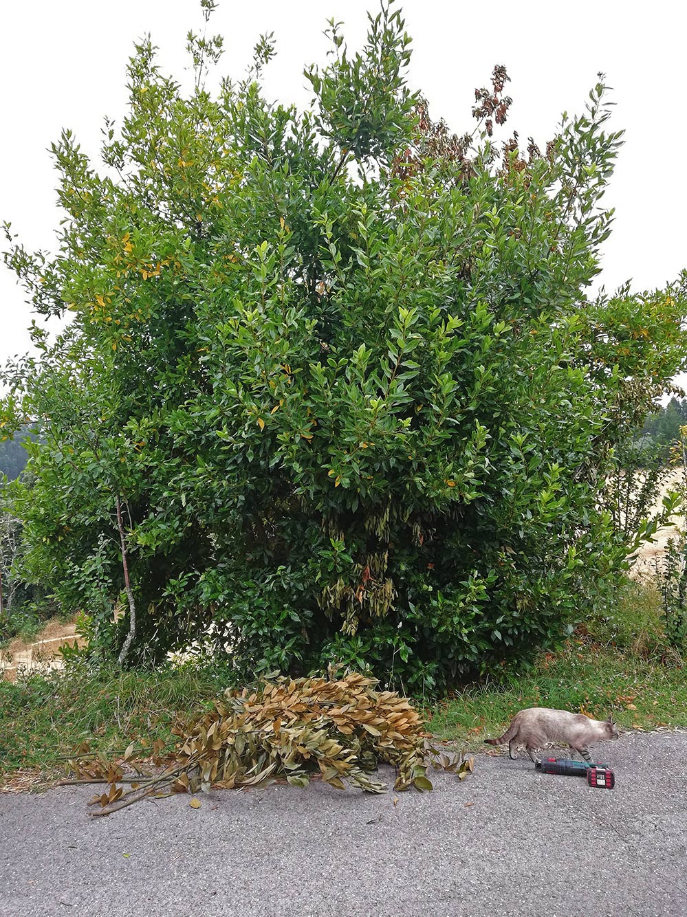 De laurier heeft het moeilijk. Waarschijnlijk doordat de mannen van het dak van het oude huis de resten cement van het schoonmaken van de spullen in de berm gegooid hebben. Hierdoor zit er erg veel kalk in de grond en de cementresten worden ook hard, dus best kans dat dat de boel verstikt. De hoogste takken zijn op de foto er al uitgehaald. Op het pleintje ligt een enorme berg takken en bruine bladeren. Op zich is het niet zo’n probleem. De laurier moest hoognodig aangepakt worden. De struik bestaat uit een stuk of vijftien stammen, alle zo’n tien centimeter in doorsnee. De struik begon al een paar kleine pruimenboompjes te omarmen, die waren bijna niet meer te zien. We gaan daarom de struik ontdoen van alle stukken die doodgegaan zijn en dan kijken wat er overblijft. In het ergste geval zagen we alles tot op zo’n twintig, dertig centimeter boven de grond af en kijken wat er dan nog uitloopt.