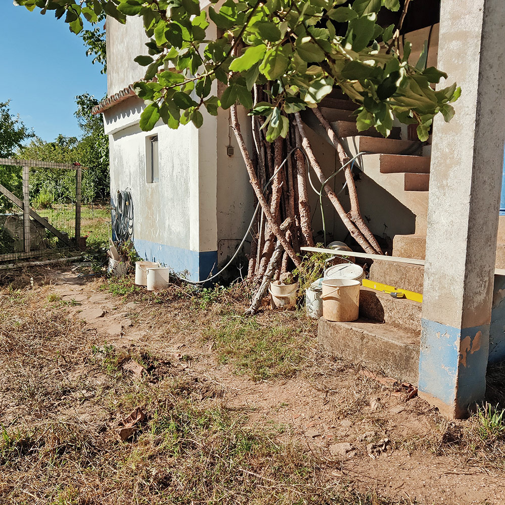 Het volgende project. Waar zijn we nu weer aan begonnen. Het pad, beter gezegd het paadje, dat achter het appartement doorloopt, dat eigenlijk het voorterrein verbindt met het achterterrein, is behoorlijk ongelijk. Het is langzamerhand weg aan het zakken. De vorige bewoners hadden er een soort muurtje naast gemaakt, maar dat zat letterlijk met los zand aan elkaar. Na elke regenbui spoelt er weer een beetje zand weg en in de loop van de afgelopen paar jaar is het meer een helling dan een pad. Het pad zelf bestaat uit scherven van dakpannen met een dun laagje cement eroverheen. Dat laagje cement is op veel plaatsten gebroken, je kunt eigenlijk meer spreken van stapstenen. Sommige scherven zijn nogal groot, hier en daar steken punten omhoog uit het pad. Niet scherp, maar wel erg lastig, zeker als je ’s avonds erover loopt, in het donker, met klompen. We gaan nu de scherven en brokken puin uitgraven, we maken een mooi diep gat. In dat gat laten we puin verdwijnen dat nu her en der in stapels en bergen op het terrein ligt. Regulier afvoeren is een hoop gedoe en dat kan je eigenlijk maar stukje bij beetje doen. Over het puin komt dan een laag gewapend beton, daaroverheen dikke tegels, zodat we een goed en stevig looppad hebben. Het looppad moet eindigen op het nog te bouwen terras aan de voorkant waar we ook nog een alpendre willen bouwen.