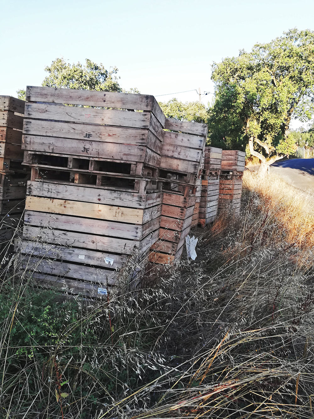 De appeloogst staat op het punt van beginnen. De kisten zijn eind vorige week neergezet. Ze staan zo scheef als maar kan. Niet allemaal, hoor, sommige staan keurig rechtop, maar sommige staan zo ver uit het lood dat je er niet langs durft te lopen, bang dat door het trillen van de voetstappen de bovenste omkukelen. Gelukkig staan ze niet wankel, anders zouden ze met een zuchtje wind al omgaan. Het waait af en toe best hard, maar ze blijven gelukkig staan.