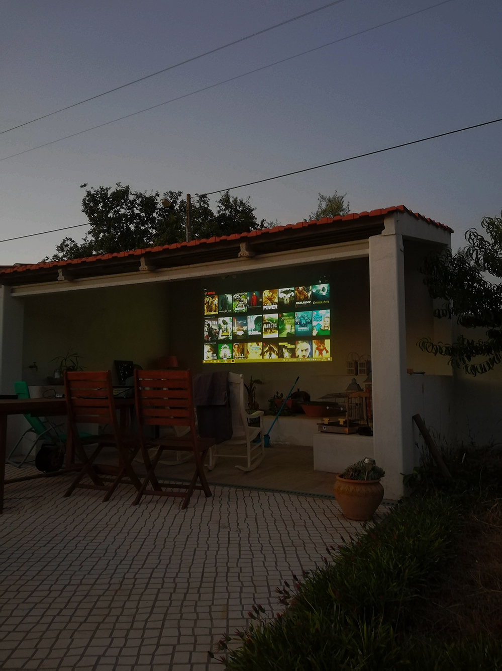 De alpendre heeft een mooie witte muur. Ooit nog geschilderd door Jan, onze eerste vrijwilliger. Die mooie witte muur is gebruikt als scherm voor onze eigen openluchtbioscoop. Geweldig resultaat. ’t Moet natuurlijk donker zijn, anders werkt het niet lekker, maar de nachten beginnen alweer wat langer te worden en op een redelijk tijdstip konden we film gaan kijken. Beamer geplaatst, computer aangesloten, bluetooth speaker gelinkt en hup draaien maar. Hoe donkerder het wordt hoe beter het gaat. In het begin lijkt het beeld een beetje onscherp, de beamer is ‘slechts’ VGA, maar dat went snel en eenmaal in de film heb je daar geen erg meer in. We hebben gekeken naar Buster’s Mal Heart.