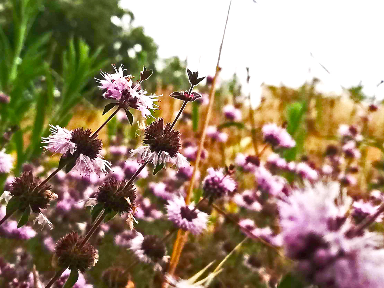 We hebben het al eens eerder gehad, over de chocolademunt. Die plant waarvan de blaadjes naar After Eight ruiken als je ze tussen de vingers wrijft. Nu staat het in bloei en zie je plotseling hele velden lichtpaars gekleurd. Het bloemetje is bijzonder, het is een steeltje met een paar kransjes op een afstandje van elkaar. Het land van de buren, dat met de olijfbomen, is pas geschoond, maar de plantjes hebben daar niet onder geleden en ze staan lekker te bloeien. Misschien doen ze het zelfs wel beter doordat de concurrentie om ze heen weg is. Het gras en de uitgebloeide planten stonden een halve meter of meer hoog en de chocolademunt is voor het bloeien een lage plant, bijna een bodembedekker.