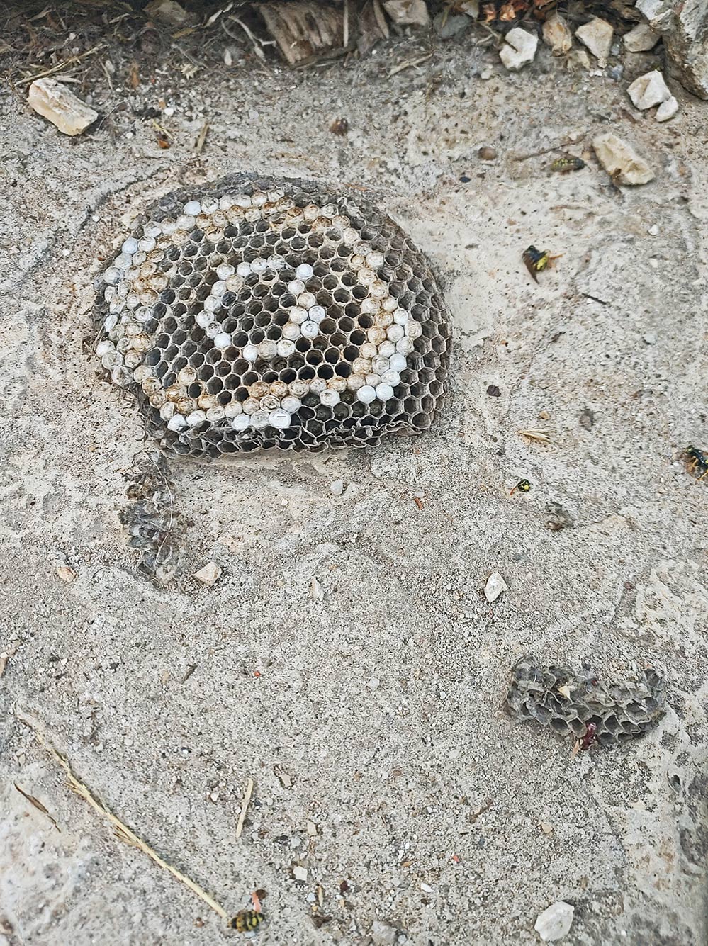 Met zo’n hondenhok wordt het dan wel uitkijken, want je kunt niet zo goed waar je spuit en je wilt zelf het spul ook niet inademen. Dan maar een beetje in de buurt van de nok van het hok spuiten waar je vermoedt dat de beestjes zitten. Meteen vallen de wespen naar beneden. Sommige kruipen ook weer op en vliegen weg, dat zijn de engste. Na een tijdje leken we alles wel te pakken te hebben en nog wel zonder steken, gelukkig. Voorzichtig met een hak een beetje gerommeld en daar kwam het nest naar beneden zetten. Een plakkaat van vijftien centimeter doorsnede. Brrr. Gelukkig zonder levende wespen. We hebben ze niet nageteld, maar het waren zeker zo’n vijftig beestjes, die we bij elkaar geveegd hebben.