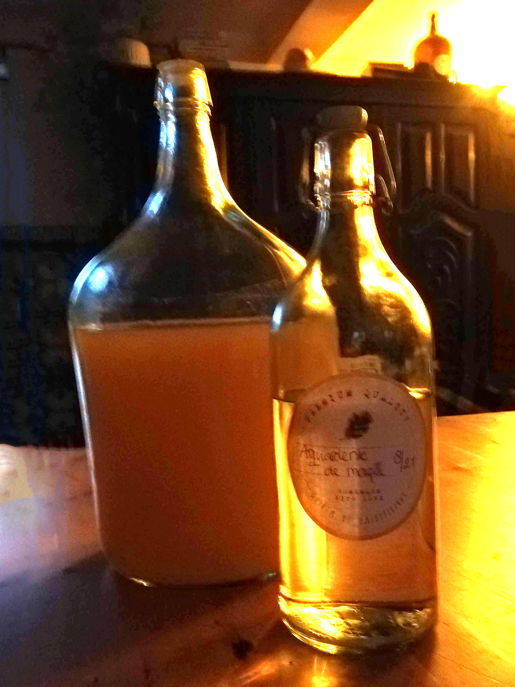 ’n Beetje beroerde foto, maar dat past wel een beetje bij het onderwerp. Gemaakt: ruim één liter Aguardente de Maçã en bijna vier liter Limoncello. De aguardente is van appels die voor een deel uit de tuin van Anita komen. In 2019! En een deel van de valappels van de appelboomgaard langs het weggetje. Twee jaar geleden al aan stukken gesneden, gefermenteerd en tweemaal gedestilleerd tot een alcoholpercentage van 84%. Twee jaar laten staan en toen verdund tot een percentage van net onder de veertig. Resultaat: een zachte aguardente, niet te scherp en ook niet te slap. De limoncello is van tot alcohol vergiste suiker, ook tweemaal gedestilleerd tot zo’n 85%. Volgens Italiaans recept (via Eloy) citroenschillen erbij, ruim een jaar laten staan; eigenlijk veel te lang volgens hetzelfde recept. Water met suiker opwarmen tot een siroopje. Erbij doen en klaar! Nog vijf tot zes maanden wachten dan is het het best drinkbaar, maar stiekem hebben we al wat geprobeerd.