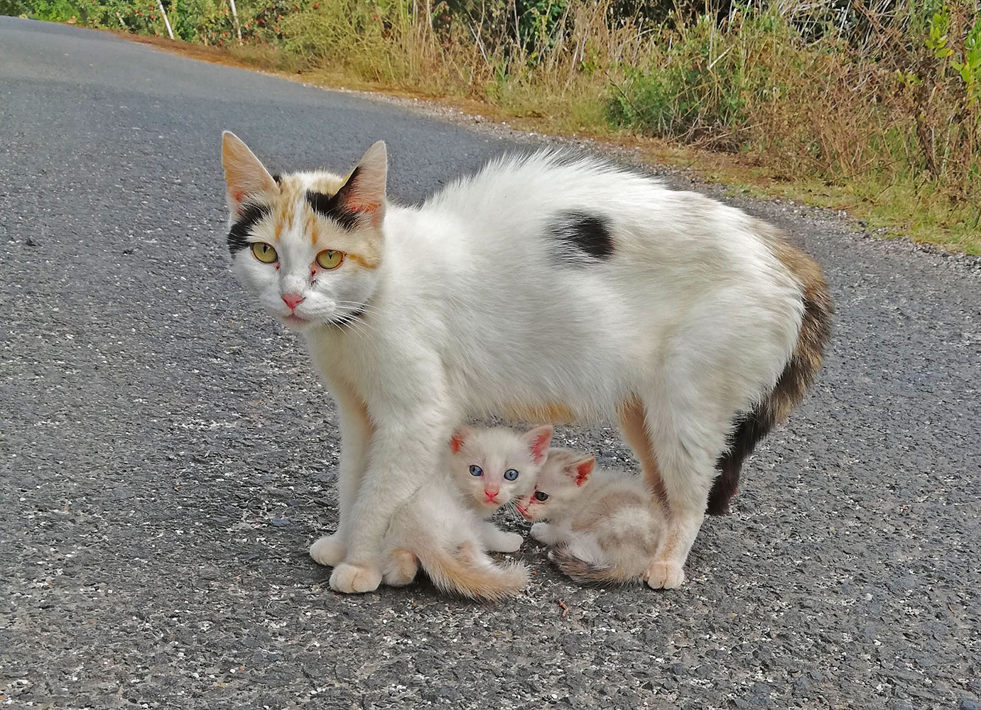 Waarschijnlijk is het nestje wat groter geweest want twee kittens is wel een beetje klein, aan de andere kant, je weet het niet. De moederpoes heeft een bandje om, die hoort ergens thuis, maar waar weten we ook niet en of de eigenaar weet of ze zwanger was is ook niet bekend. We hebben Karma op afstand gehouden en Tomás en Milan waren gelukkig al ergens anders aan het zwerven. De kleintjes maken weinig kans, tenzij de moeder ze mee naar haar huis neemt.
