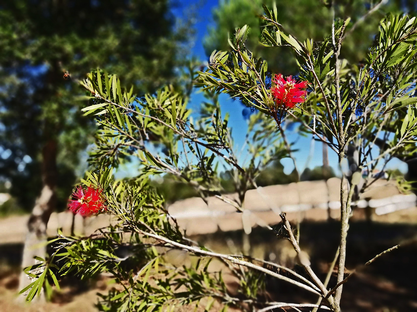 Van het voorjaar heeft Amanda een prachtige plant gekregen van Roy. Helaas wilde hij het maar niet doen. In eerste instantie doordat de honden aan de wortels krabden. We hebben er toen van dat groene gaas een hekje omheen gezet, maar dat konden de honden niet goed zien, daarom liepen ze als ze aan het vechten waren er nogal eens tegenaan. Daar kon-ie ook al niet zo goed tegen. Toen hebben we er van takken een soort van afrastering omheen gemaakt. Het waren aan elkaar gemaakte takken, verbonden door ijzerdraad. Dat was oorspronkelijk bedoeld om de kippen uit de siertuin te houden, maar nu de kippen in de ren zitten is dat een beetje overbodig. Nu gebruiken we dat dus voor een hekje. ’t Staat nog decoratief ook. En zowaar de plant bloeit op. Letterlijk. Er zitten nu drie bloemen in. Het ziet er nog iel uit, maar de plant is van zichzelf al een beetje ielig. In het Nederlands heet de plant Lampenpoetser, in het Portugees Escova-de-Garrafa, dat Flessenborstel betekent.