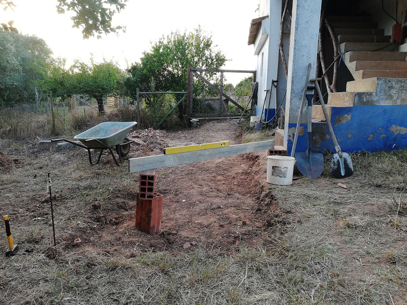 We zijn weer verdergegaan aan het gat waar het pad moet komen dat van voor het huis naar achter gaat. Het wordt een stuk van een meter of acht. We hebben berekend dat het een bak moet worden van zo’n 70 cm diep. De zijkant wordt een muurtje van drie stenen hoog. Aan de hoogste kant hebben we al zo’n dertig cm afgegraven. Waar het terrein een stuk lager ligt misschien net een paar centimeter. Eigenlijk alleen de bovenste laag met het gras en de wortels.
