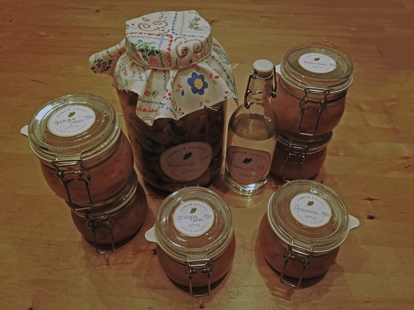 De perenboom heeft lekker veel peren gegeven. Redelijk grote. De zondagse productie heeft van alles opgeleverd: Perenazijn -moet nog wel een maand of wat staan, voordat het azijn is, ingemaakte gestoofde peren en ingemaakte perenmoes -kunnen wel een maand of wat blijven staan.
