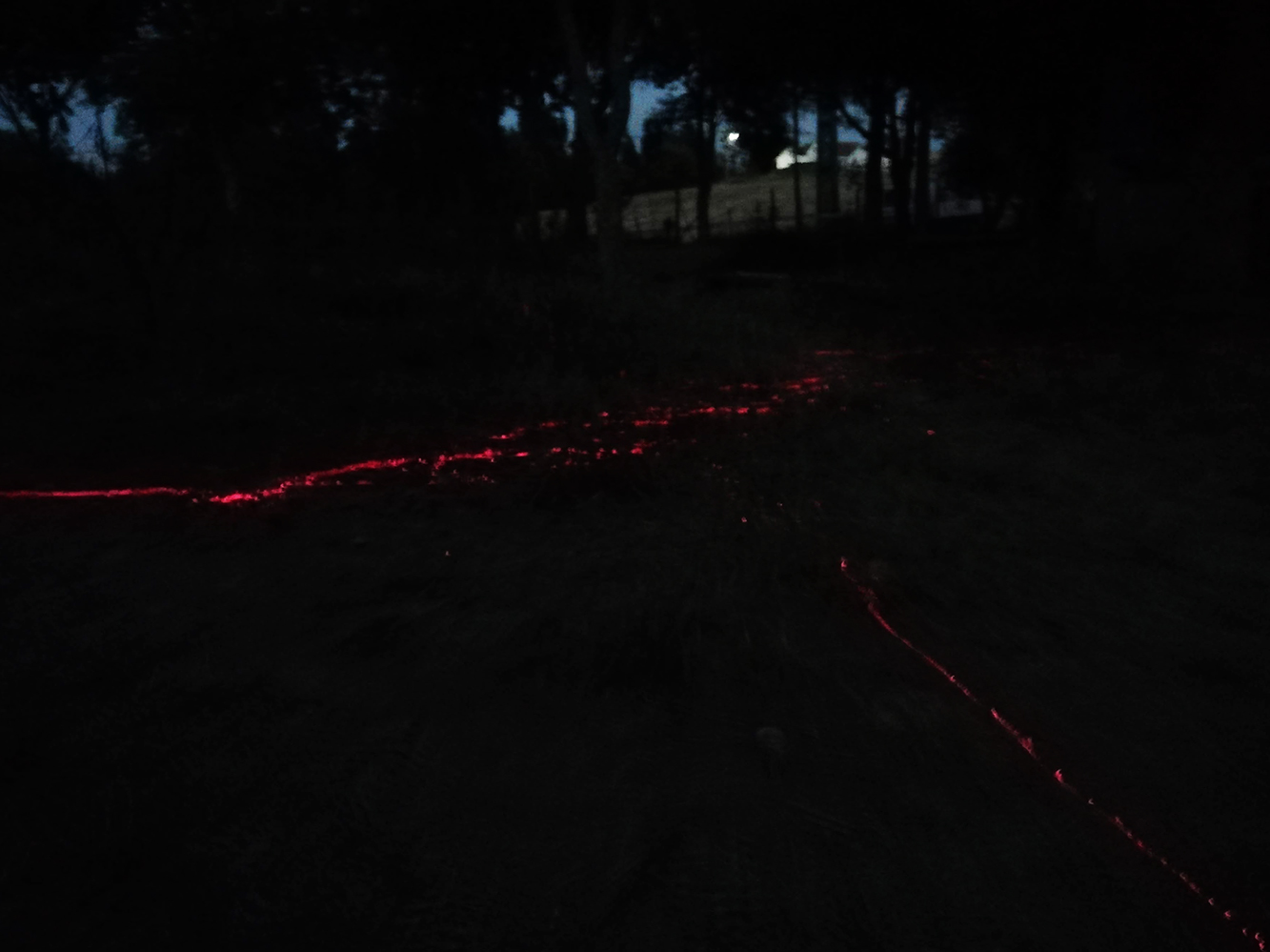 Als het dan echt donker wordt, kunnen we niet meer meten, laat staan graven, maar de laser geeft wel een mooi sprookjesachtig effect, waar de horizontale lijn van de terrashoogte over het terrein strijkt.