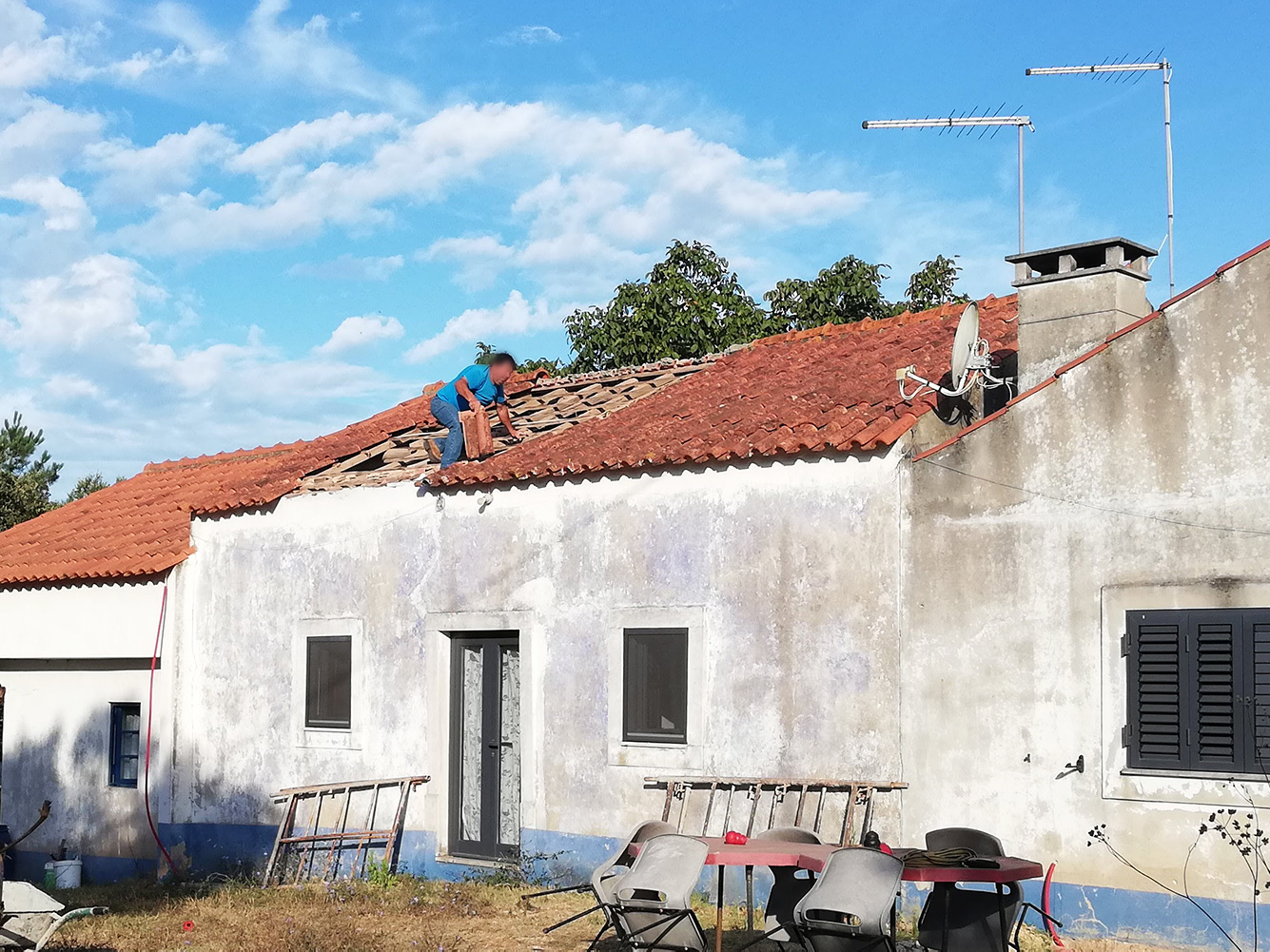 Drie jaar geleden bijna hebben we al offerte aangevraagd. Door allerlei redenen kwam het er maar niet van. Ongelukkige val van Joaquim, Covid, overvloedige regen, misverstanden. Maar nu is het zover, we zijn begonnen, het dak van het middenstuk van het huis wordt vervangen en meteen een stukje verhoogd, zodat we een royale ruimte boven hebben en je niet steeds je hoofd stoot tegen de balken. De muren worden zo’n 70 cm verhoogd, er komen nieuwe balken in en twee dakramen. ’t Zal een heel ander gezicht worden. De situatie op de foto is van kwart voor negen ’s ochtends, de mannen houden van aanpakken.