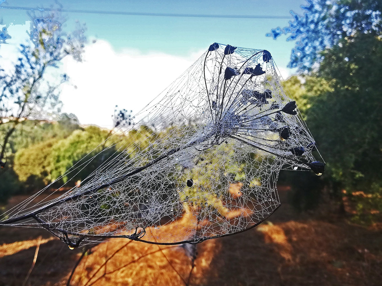 Het Fluitenkruid (het staat erg raar met een -n- maar de spellingchecker wijst er voortdurend op dat die -n- ertussen moet) is uitgebloeid en de bloemen op steeltjes zijn langzamerhand zaadjes geworden. De spinnen gebruiken zo’n bloemkop om een prachtig bouwsel te maken. Alle bloemen hebben zo hun eigen spin, waardoor je een soort van boeket van spinnenwebben krijgt.