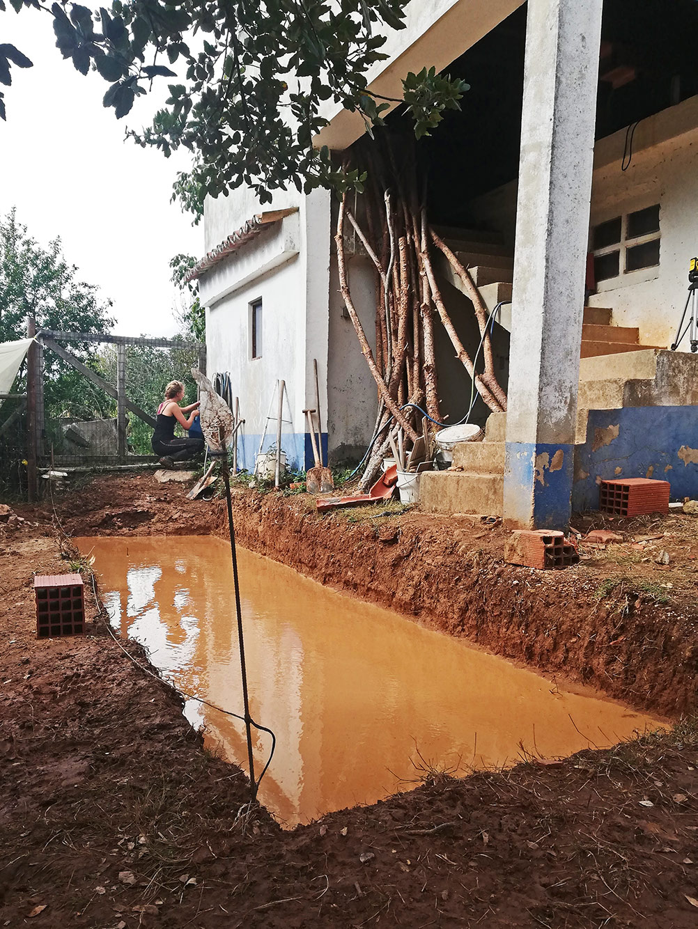 De regen komt slecht uit vanwege het dak, want daardoor staat het werk stil, maar het goede is weer aan de andere kant dat het regenwater zich verzamelt in het gegraven gat. Als je dan een stuk vindt waar het gat diep genoeg is, hoef je alleen maar een stok te hebben en het waterniveau op de stok te markeren. Een parasolstok en een stukje tie-rip doen het dan goed.