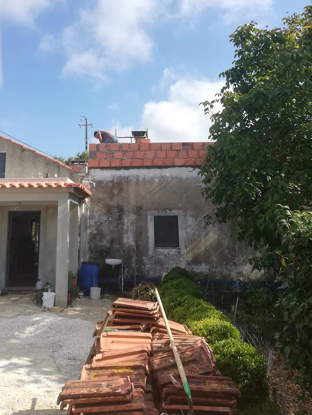 Nu is het zeil weg en lijkt het de komende dagen droog te blijven. Joaquim en Ilídio zijn begonnen de muren op te hogen (er komt zo’n 70 cm bij), het dak is nu weer helemaal open. De zon heeft de hele dag geschenen en daardoor verdwijnt het vocht hopelijk ook weer snel.