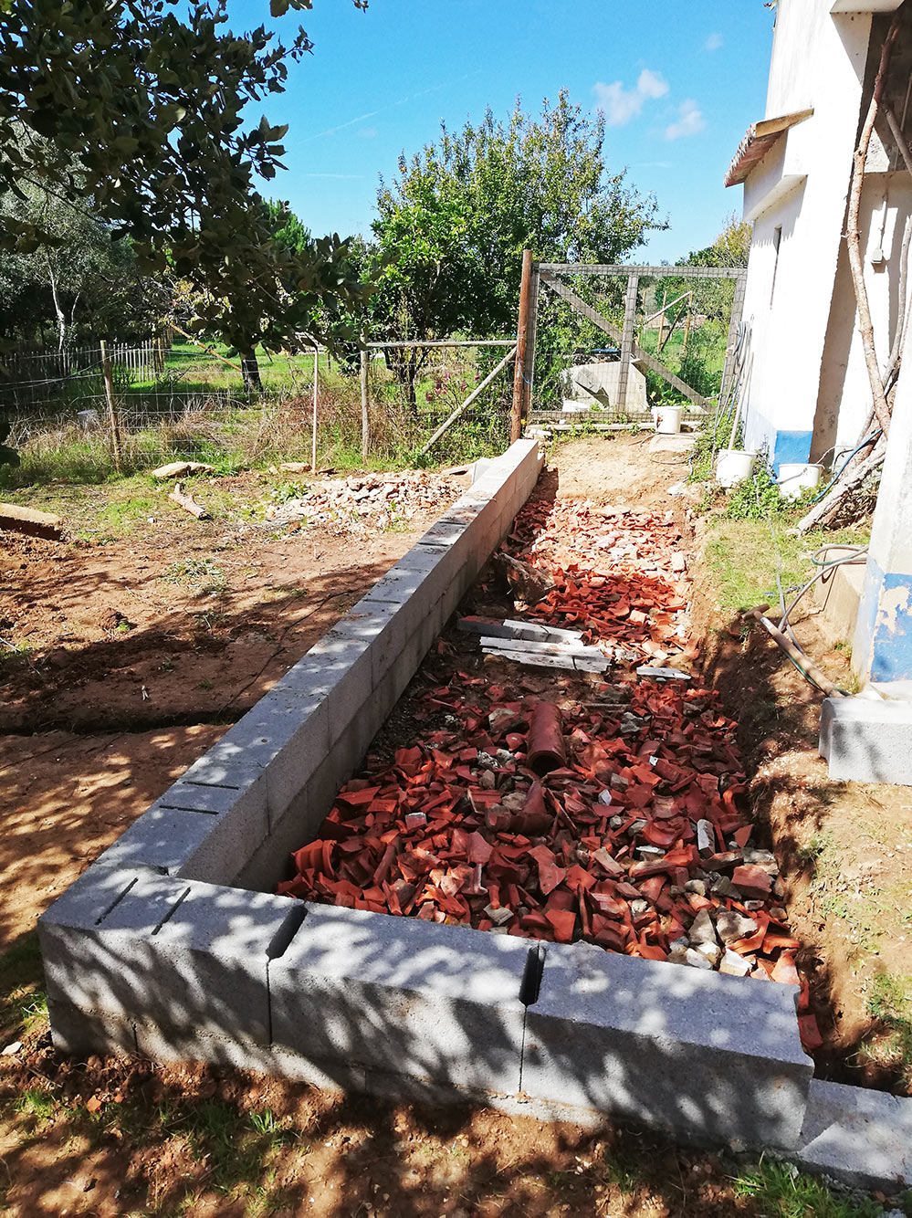 Het voormalige zwembad, de bak die we achter ons huis gegraven hebben, zijn we nu vol aan het storten met allerhande puin dat we verzameld hebben. Van het dak van het oude huis hebben we veel, van de gaten die gegraven zijn voor het afdak bij de deur. Wat we verder gevonden hebben op het terrein. We hadden alweer heel wat verzameld. Ook van het nieuwe dak komt weer een hoop. Dakpannen die op maat gesneden moeten worden. Stukken muur die weggebroken moesten worden. Alles bij elkaar een flinke berg die we nu als fundament voor het terras/pad gaan gebruiken.