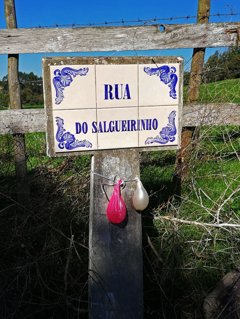 Het ziet er een beetje sneu uit. Twee ballonnetjes aan het straatnaambordje.