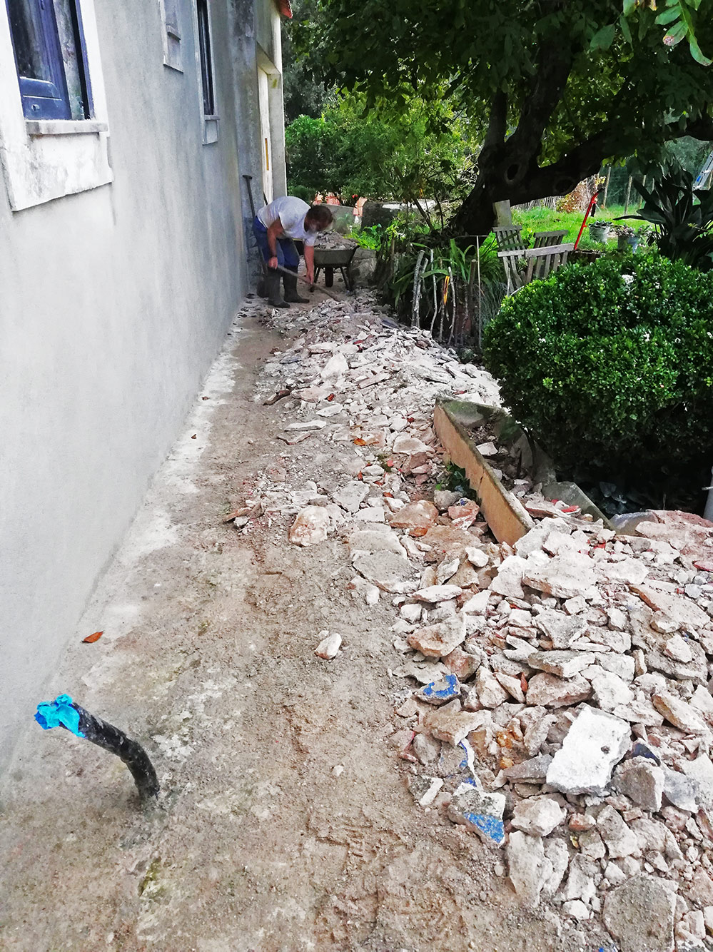 Als de gevel wordt ontdaan van het oude stucwerk, dan ontstaat er een onvoorstelbare hoeveelheid troep. In het pad ligt nu een aardige berg. Joaquim en Ilídio hebben het een beetje opgeschoven zodat ze ook de onderkant van de gevel kunnen stuken. Rest ons om het puin te ruimen. Uiteindelijk verdwijnt het allemaal in het gat dat achter het huis langsloopt. Of beter gezegd moet gaan lopen, want voorlopig is het alleen nog maar een bak met puin. Het puin is nog niet op de goede hoogte, dus we stappen nu in de diepte als we achterlangs willen lopen. Het goede is dat we op deze manier het puin mooi weg kunnen werken. We hoeven het niet af te laten voeren, we hoeven het alleen maar naar achteren te verplaatsen. Het is een hoop schepwerk maar het resultaat is geweldig. Morgen krijgen we weer twee vrijwilligers, dat scheelt sowieso twee stel handen.