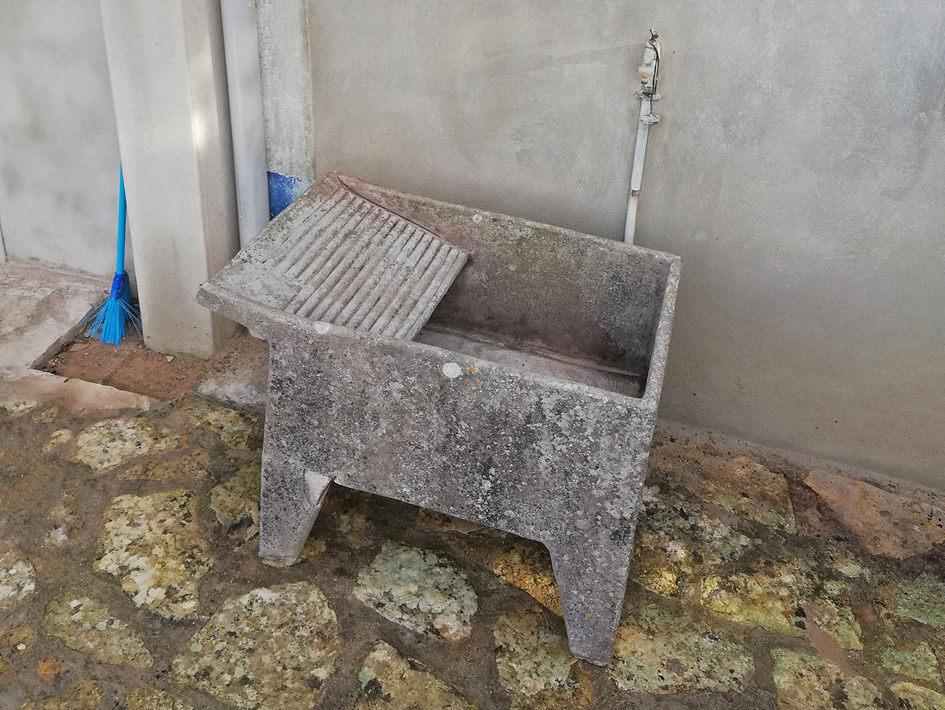 Drie jaar geleden hebben we een hek geplaatst, met Miguel uit Casal da Marinha. Er stond een authentiek Portugese wasbak in de weg, dus die hebben we toen opzij gezet. We hadden wel een klein ongelukje want bij het wegzetten steunde de wasbak even op één poot en die brak toen af. Jammer.