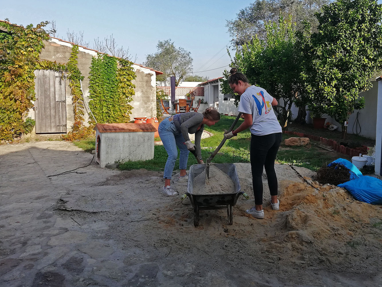 Nu de kuil achter het huis, voorheen het zwembadje, vol ligt met puin kan er zand overheen. We hebben twee vrijwilligers, meiden uit Duitsland, die daar vanochtend mee bezig zijn geweest. Lekker heen en weer lopen met kruiwagens. Er zijn zo’n twaalf kruiwagens in het gat verdwenen. ’t Zakt helemaal weg tussen het puin, zo’n zandberg lijkt heel wat, maar tusen het puin verdwijnt het helemaal.