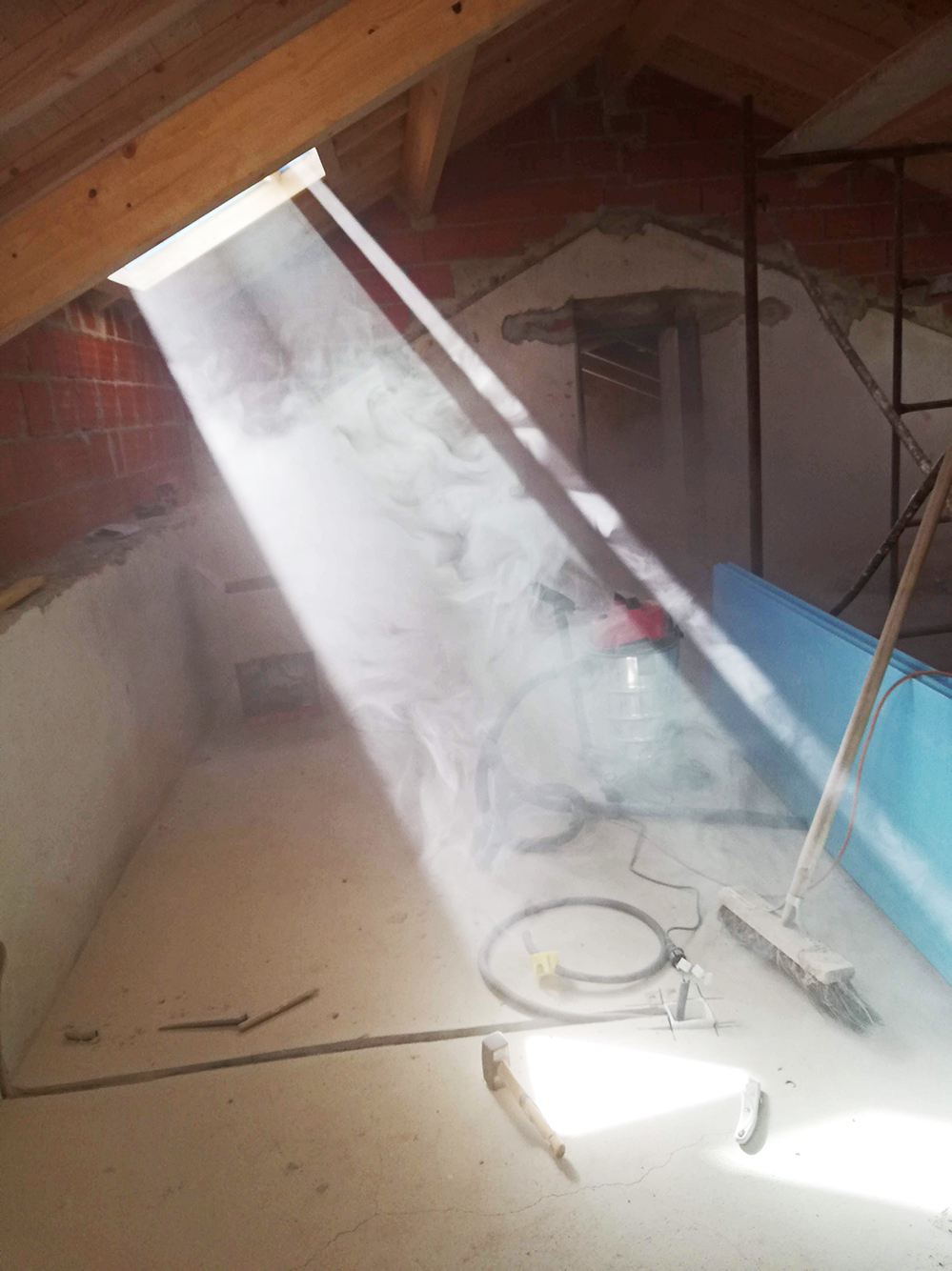 Als er een paar meter geslepen is met de haakse slijper, staat het stijf van het stof. Gelukkig hebben we een paar ramen laten inbouwen en daardoor gaat het stof ook weer redelijk snel weg. Het stof geeft ook wel mooie artistieke plaatjes. Als je een beetje moe bent van het op je knieën zitten, kun je mooi even een abstracte pauze houden en genieten van de wervelingen, voordat het door het raam verdwijnt.