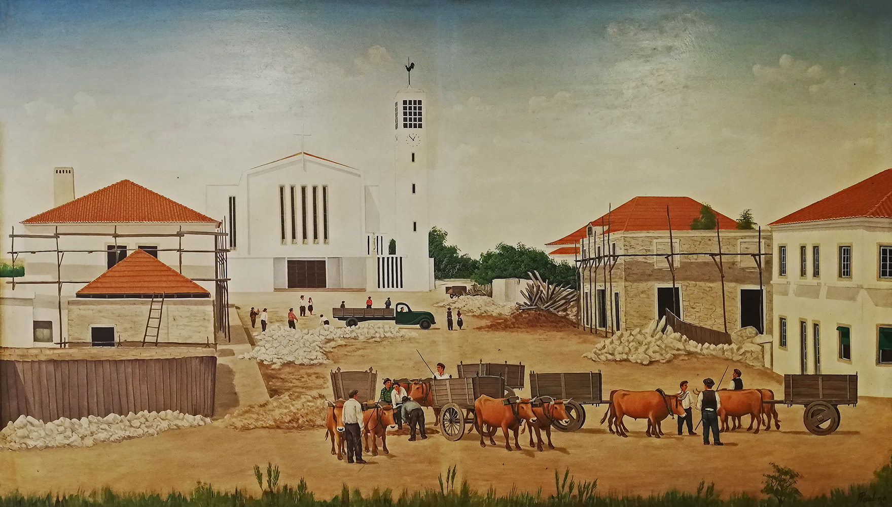 In de pastelaria hing dit schilderij. Het is gemaakt in 1955 en toont de Avenida de Igreja (zeg maar Kerklaan) in aanbouw, met de toen nieuwe kerk in de achtergrond. De kerk is in de plaats gekomen van een klein kerkje dat meer naar rechts stond. Een prachtig mooi gebouwtje, de toenmalige heren of dames die erover gingen wilden waarschijnlijk iets moderns. Nou dat is dan deze kerk. Hij wordt door de buurman gekscherend ‘Het Magazijn’, genoemd.