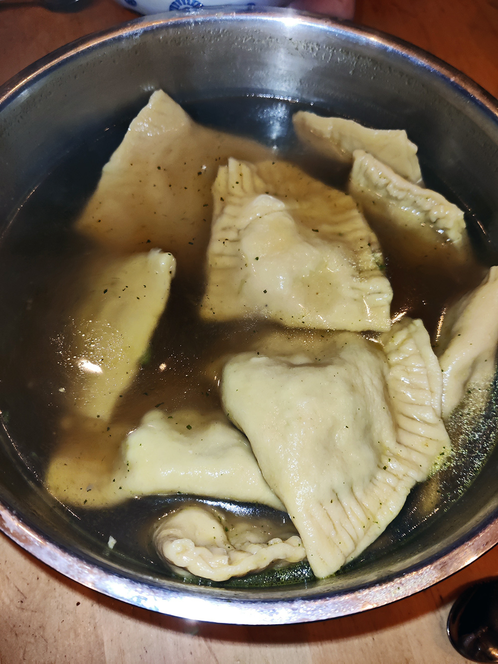 Viola en Hanna zijn vandaag voor het laatst. Als een soort van afscheidscadeautje gingen ze vandaag voor ons koken. Een echt Duits gerecht, zij het voornamelijk uit het zuiden van Duitsland. Viola’s moeder komt daar vandaan en ze heeft de receptuur overgenomen. Het heet Maultasche, oftewel Muilzak. Niet echt een appetijtelijke naam, maar het is er zeker niet minder lekker om. Het is een soort grote ravioli, gevuld met gehakt en spinazie, gekookt en dan in een bouillon. Fantastisch.