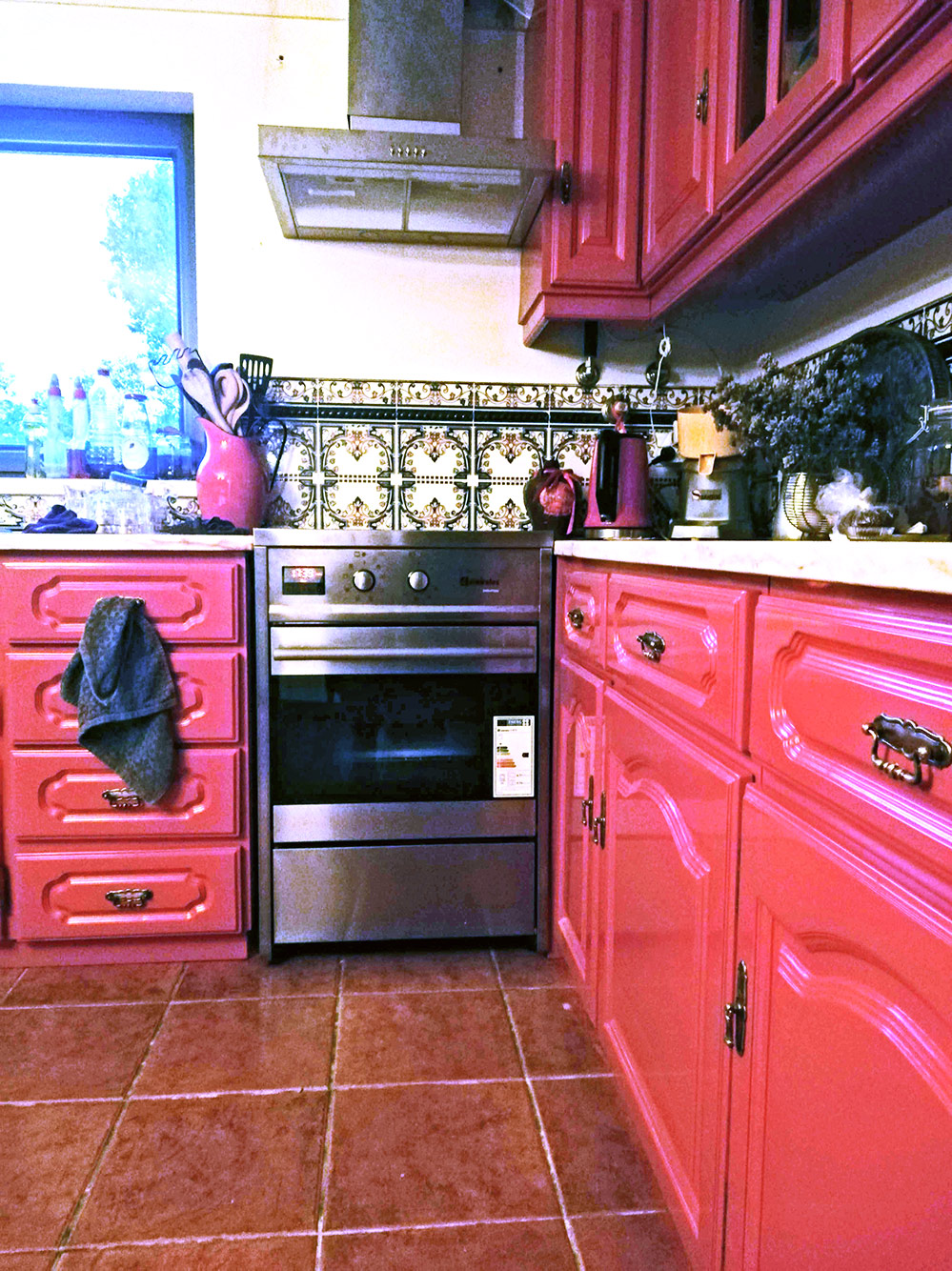 Na een weekendje is het gelukt. Het fornuis, de afzuigkap én de koelkast, ze staan allemaal. Voor het fornuis moest het keukenblad 1 cm opschuiven. Het blad was losgesneden van de randen en we dachten met een krik voldoende kracht te kunnen zetten om het te laten schuiven. Mis. Een autokrik werkt niet in horizontale richting. De olie die voor de druk moet zorgen loopt weg uit de cylinder. Of zoiets.