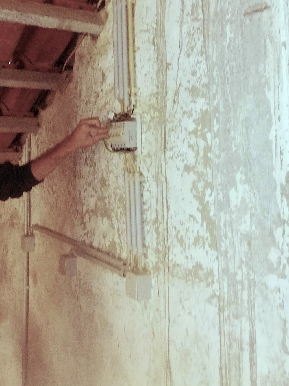 En de nieuwe zolder heeft licht. Er is twee weken aan gewerkt, er zijn negen stopcontacten aangelegd, en een dubbele hotelschakeling. En nu de eer aan Clemens om de schakelaar om te halen. Het magische moment! De zolder heeft een eigen groep gekregen, die was al aangelegd door de elektricien een paar weken geleden, toen de drie-fasenaansluiting in de keuken werd gemaakt. De stop voor de groep zat al in het nieuwe stoppenkastje maar was nog niet aangesloten. Clemens wist niet zo veel van elektriciteit (hij wist bijvoorbeeld niet waarvoor de aarde diende), maar hij leert snel en heeft eigenlijk alle aansluitingen voor zijn rekening genomen. En, het goede nieuws: alles werkte in één keer, op de dubbele hotelschakeling na. Hij had een klein foutje gemaakt dat met een paar minuten rechtgezet was. Dus nu hebben we goed licht boven. Zij het met tijdelijke fittingen, de echte lampen moeten nog komen.