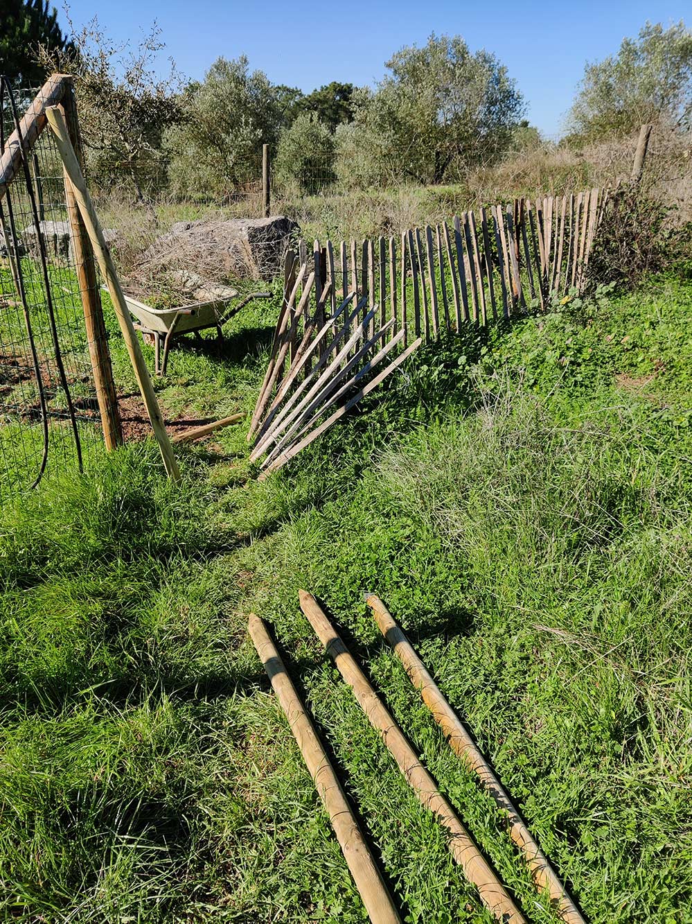 Tijd om ook het hekje eromheen aan te pakken. Het hekje was een tijdje geleden neergezet, om de kippen en de honden uit de moestuin te houden, maar het was wel erg provisorisch. Het is een schapenhek dat overeind wordt gehouden door een paar ijzeren staanders waarmee normaal een soort van steigers gebouwd wordt. Het hangt er een beetje halfslachtig bij en dichtdoen gebeurt door het ijzer om het gaas te buigen. Als je dat niet goed doet hebben Tómas en Milan dat al gauw in de gaten en krijgen het makkelijk omver.