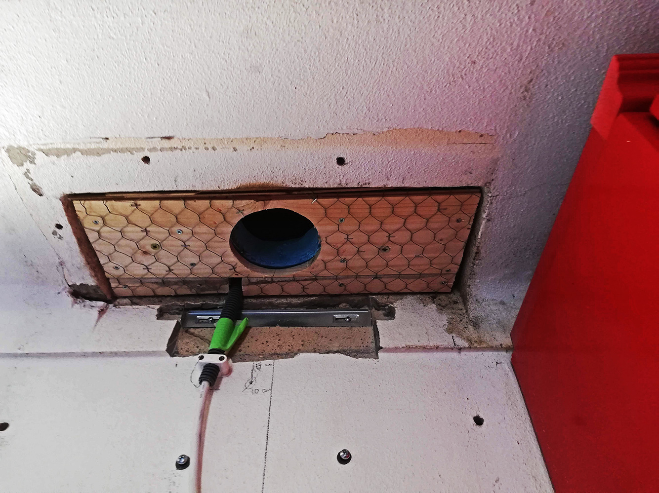 Betty kwam met de tip van Opa: houten plankje met kippengaas in het gat monteren en dat afsmeren. Gauw, gauw, dan maar een houten plankje op maat gemaakt. Mooi gat erin en nog met isolatiemateriaal ook én ruimte voor de elektriciteitspijp. Dat wilde Joaquim wel proberen. Het gat is nu mooi dichtgesmeerd en dan morgen bij licht maar eens kijken hoe het eruit ziet.