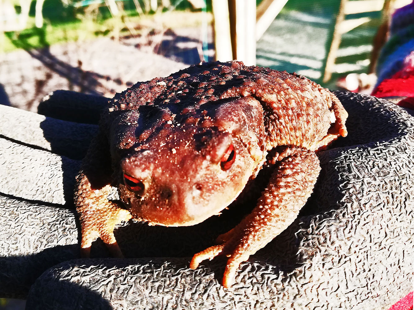 Nu Joaquim en Ilídio klaar zijn -voorlopig- kunnen wij de boel op gaan ruimen. Er lag nog een berg zand op het terrein, van dat fijne zand, en omdat het vrij nieuw is hebben we dat veiliggesteld voor de honden die er anders een prachtige speeltuin van maken. Er zijn ook nog flink wat van die terracotta stenen over. Die staan op een palet afgedekt met een plastic zeil om ze droog te houden. Onder de pallet ontstaat kennelijk een ideale plek voor deze pad om een winterslaap te gaan houden. We vonden hem weggedoken in een kuiltje onder de pallet. Hij is versuft maar wel wakker. Misschien hebben we hem wakker gemaakt, misschien was hij nog niet helemaal toe aan de winterslaap. Hij zit een beetje suf voor zich uit te kijken.