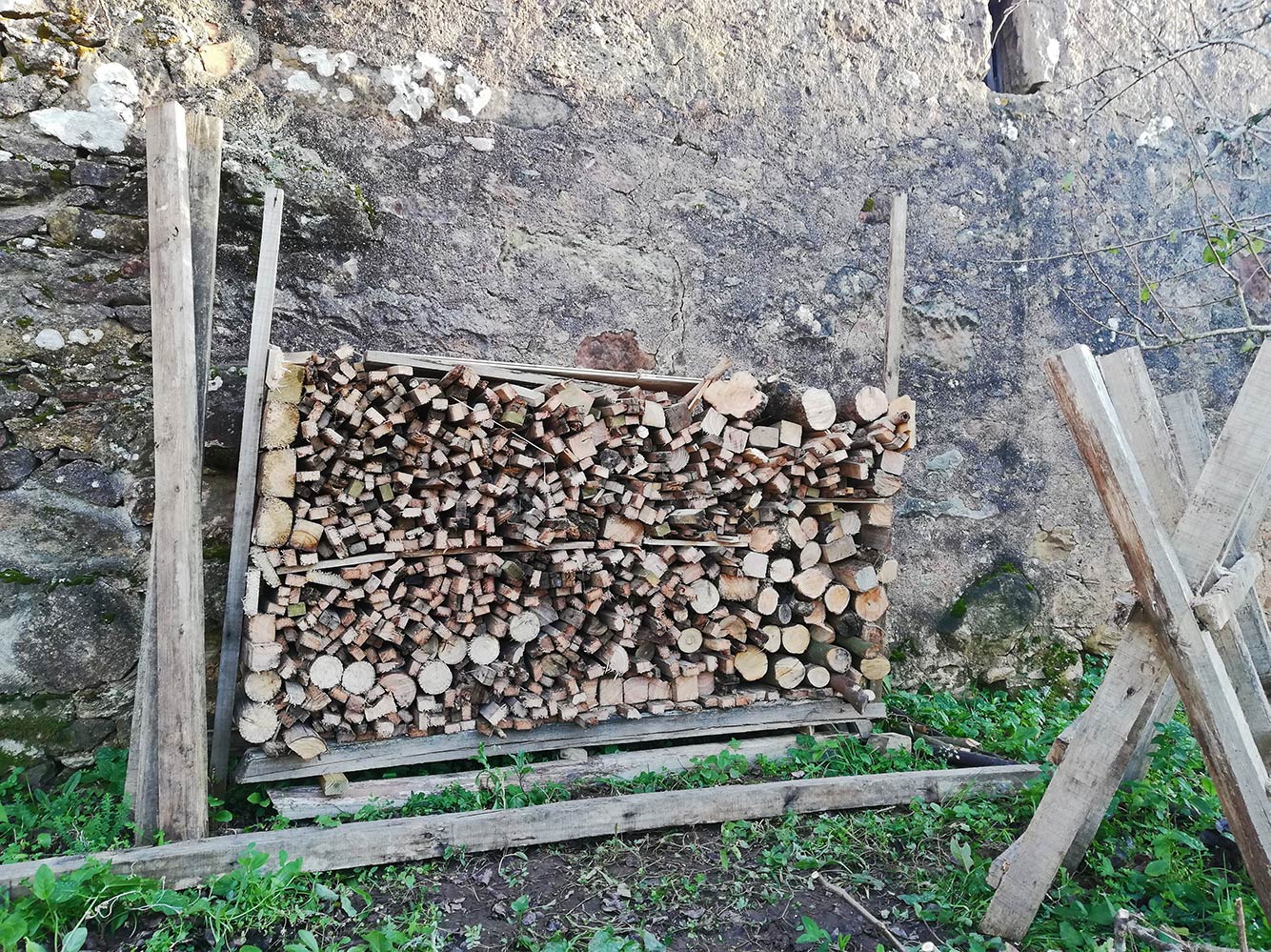 Nelie heeft de panlatten die van het oude huis afkwamen en die van het oude dak afkwamen ontdaan van spijkers. We hadden een hele berg van die panlatten liggen, sommige goed, sommige aardig aangetast door de houtworm of zelfs half verrot. Al dat hout is door Hanna en Viola netjes bij elkaar gelegd met een stuk plastic eromheen. ’t Blijft natuurlijk een doorn in het oog, zo’n berg. En omdat we de vouwwagen willen verplaatsen, moet die berg ook weg. Clemens is even lekker met de motorzaag bezig geweest en heeft de berg in een ochtend weggezaagd. Samen netjes opgestapeld en zo hebben we voorlopig weer hout genoeg voor de barbecue.