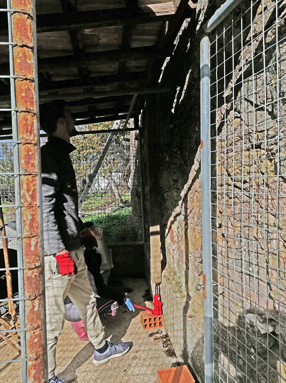 We hadden eerste een stellage gebouwd om een krik hoog genoeg te krijgen om het dak op te kunnen tillen. Dat werkte niet want de stellage kon niet dicht genoeg bij de muur staan.