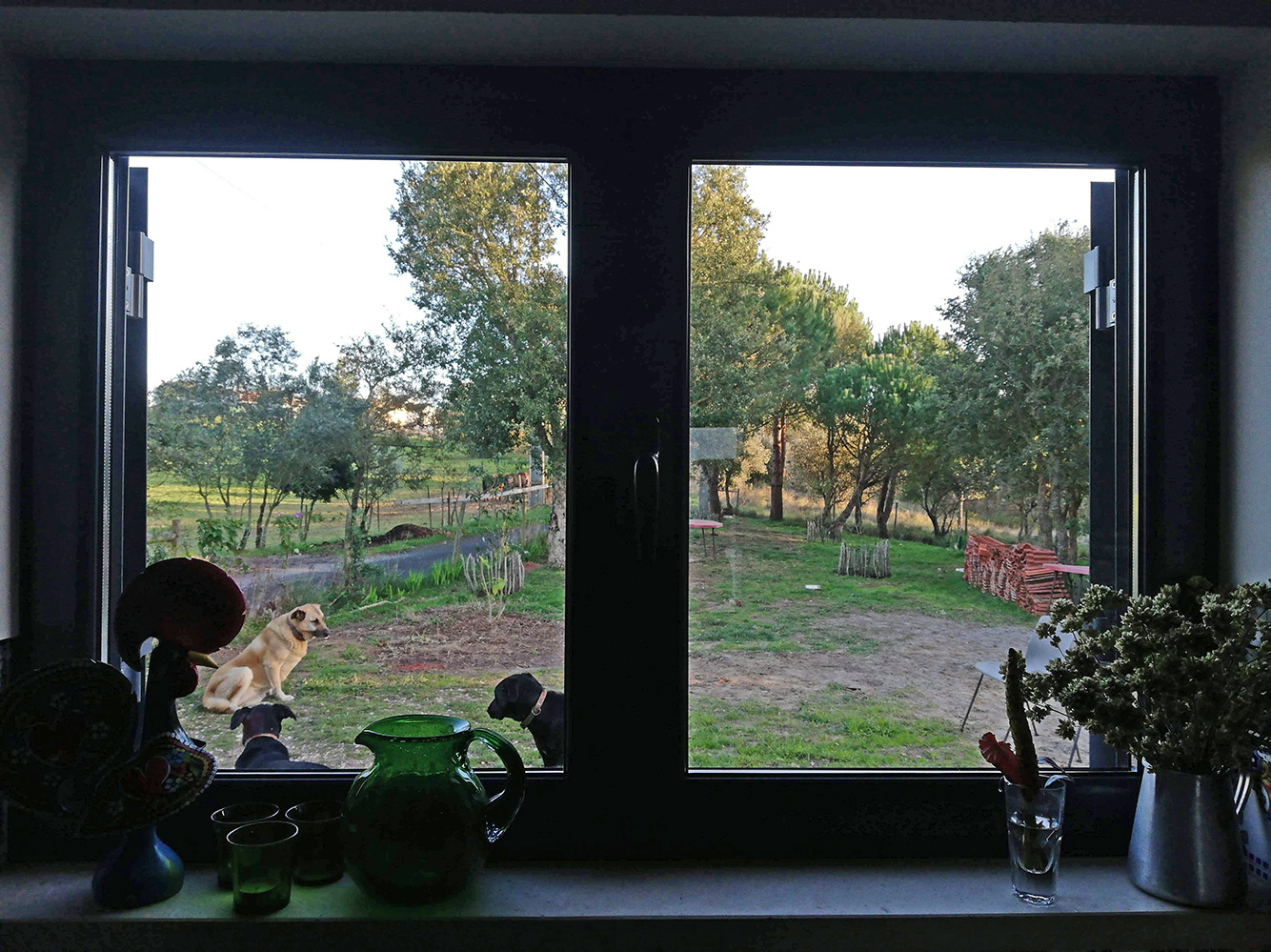 En schoon zijn de ramen! Ze zijn al zeker zes maanden niet gedaan. ’t Had geen zin, want er werd buiten gewerkt met cement en haakse slijpers. Grote stofwolken kwamen af en toe naar beneden zetten, en het werken aan de gevel met nat cement en water kon ook lekker spetteren. Nu Ilídio en Joaquim weg zijn en ook de grote regenbuien achter de rug is het een mooi moment om de ramen en de luiken goed onderhanden te nemen. Het is effe wat meer werk, met de tuinslag, emmers sop, zeem en wisser. Maar het resultaat is fantastisch. Wat een wereld van verschil. Leek het eerst altijd mistig buiten, nu kijken we door helder glas.