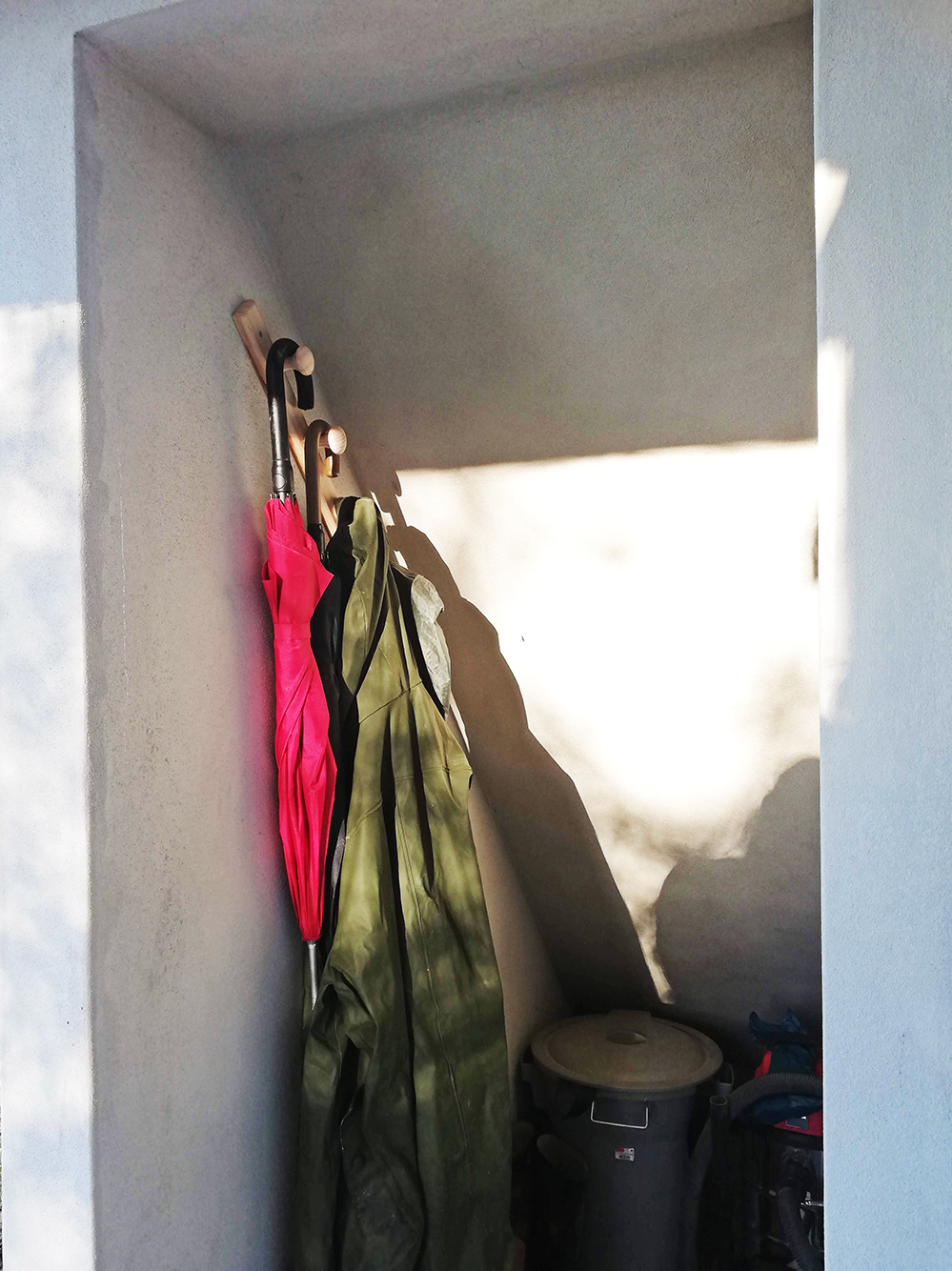 Wat kan een mens toch blij zijn met kleine dingen! Af en toe hebben we regen in deze tijd van het jaar en omdat je nooit precies weet wanneer liggen de regenjassen klaar bij het hondenvoer. Want weer of geen weer, met de honden wordt gelopen. Die jassen lagen een beetje gedrapeerd over de bak met hondenvoer en als je dan het hondenvoer pakte en het regende niet, dan lagen de regenjassen over de grond te slingeren. Niet echt handig. Maar, heel simpel, een kapstokje gekocht bij de plaatselijke Gamma (heet anders, hier is het Leroy Merlin, voorheen Aki), nou ja plaatselijk, in Benedita heb je alles maar geen Gamma of equivalent, het kapstokje komt uit Caldas, en opgehangen onder de trap, in het nieuwe hokje dat daar onlangs gemaakt is. Wat een weelde! Ineens weer een begaanbaar hok.