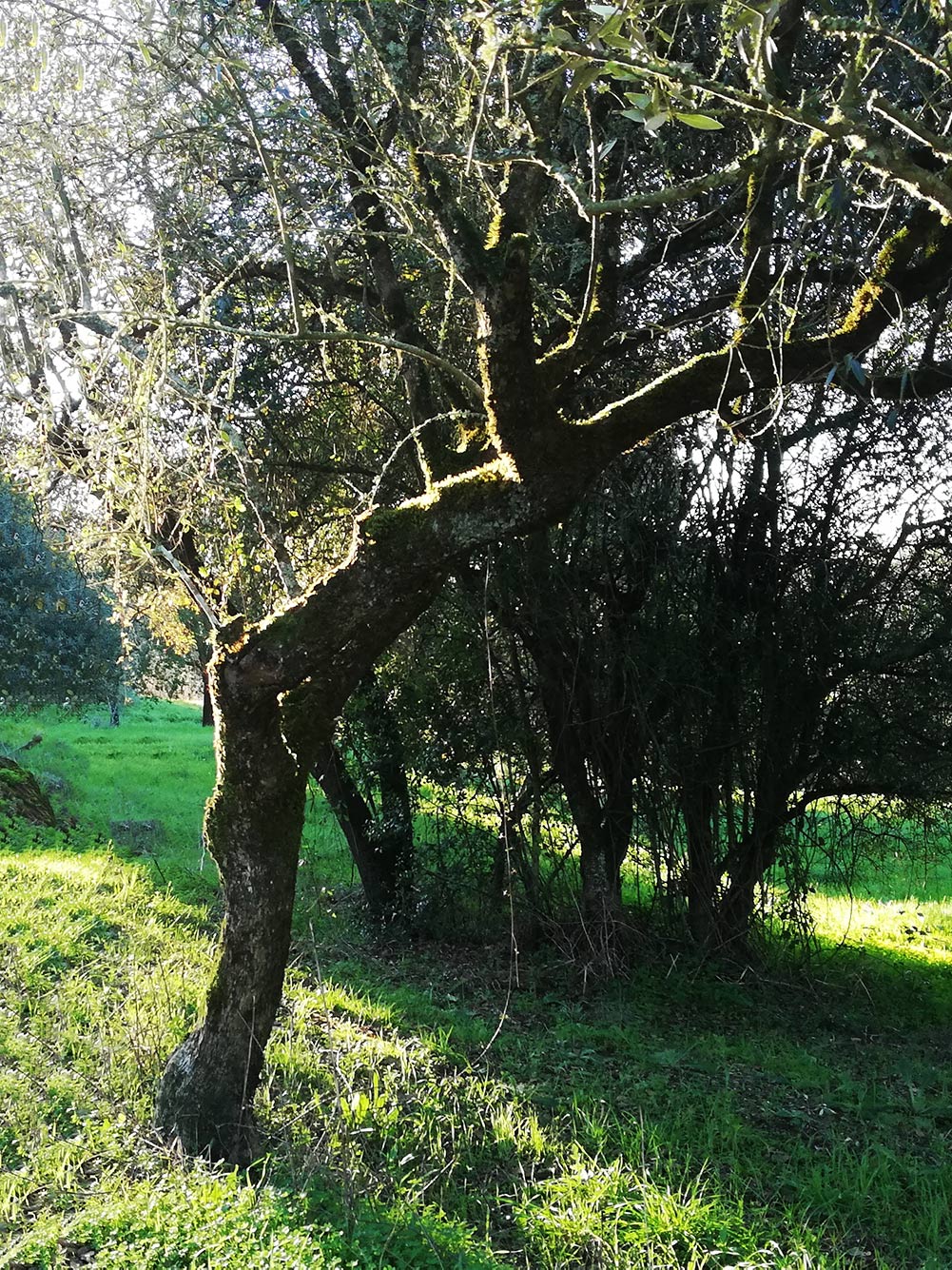 Het is ook het moment dat de zon bijna in het verlengde van het weggetje staat waardoor je eigenlijk recht in de zon loopt. Het geeft mooie lichtlijnen op de randen van de bomen. Er zit veel mos op de meeste stammen, waardoor het extra oplicht.