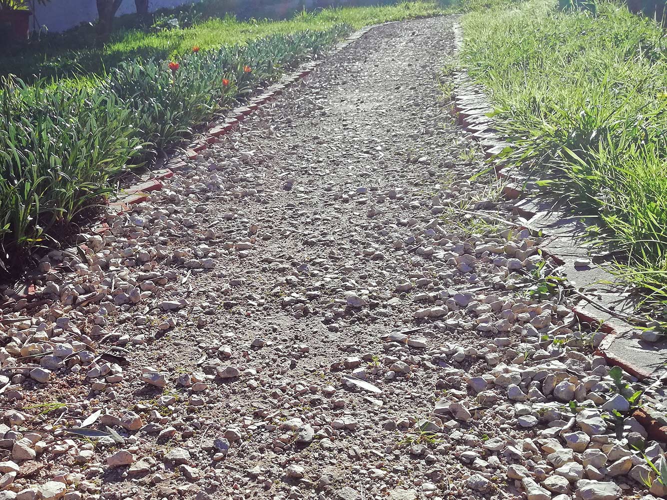 Als je een klein maandje weggeweest bent, kun je daar overal de sporen van zien. Op alle paden piepen de plantjes weer tevoorschijn. Het pad langs het oude huis is nog het minste, want dat is bedekt met toutvenant waar de plantjes moeilijk doorheen komen. Je gaat nog meer bewondering voor de natuur krijgen, want in elk klein gaatje en hoekje begint wat te groeien. ’t Moet allemaal weer weggehaald worden, want voor je het weet is het overgroeid. Op de foto is de linkerkant alweer schoon gemaakt, aan de rechterkant groeit nog van alles.