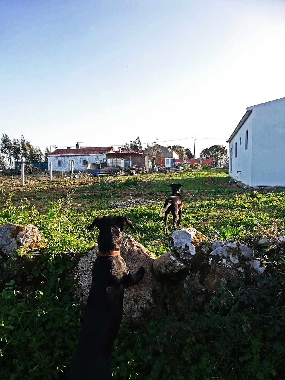 Onze Braziliaanse buren hadden een nest van vijf puppies. Die zijn nu allemaal een stuk groter. De meeste zijn al weg, er is er nog één overgebleven, een teefje, ze heet Kai. Het is bijna een kloon van haar moeder, al bijna net zo groot. Als we langs de achterkant van hun terrein lopen zit de moeder, Nina, meestal te keffen op een berg die bij hun op het terrein ligt. Ze kan dan de omgeving goed overzien. Onze honden vinden dat machtig interessant. Ze willen graag met Nina spelen, maar die duldt ze nog niet op hun terrein. Als Tomás en Milan te dichtbij komen, dan rent ze keffend op ze af. En onze honden, helden als ze zijn, laten zich afschrikken en rennen snel terug. Als Nina wel te horen is, maar niet te zien, staan ze op afstand een beetje te kijken, heel alert, klaar om weg te rennen.