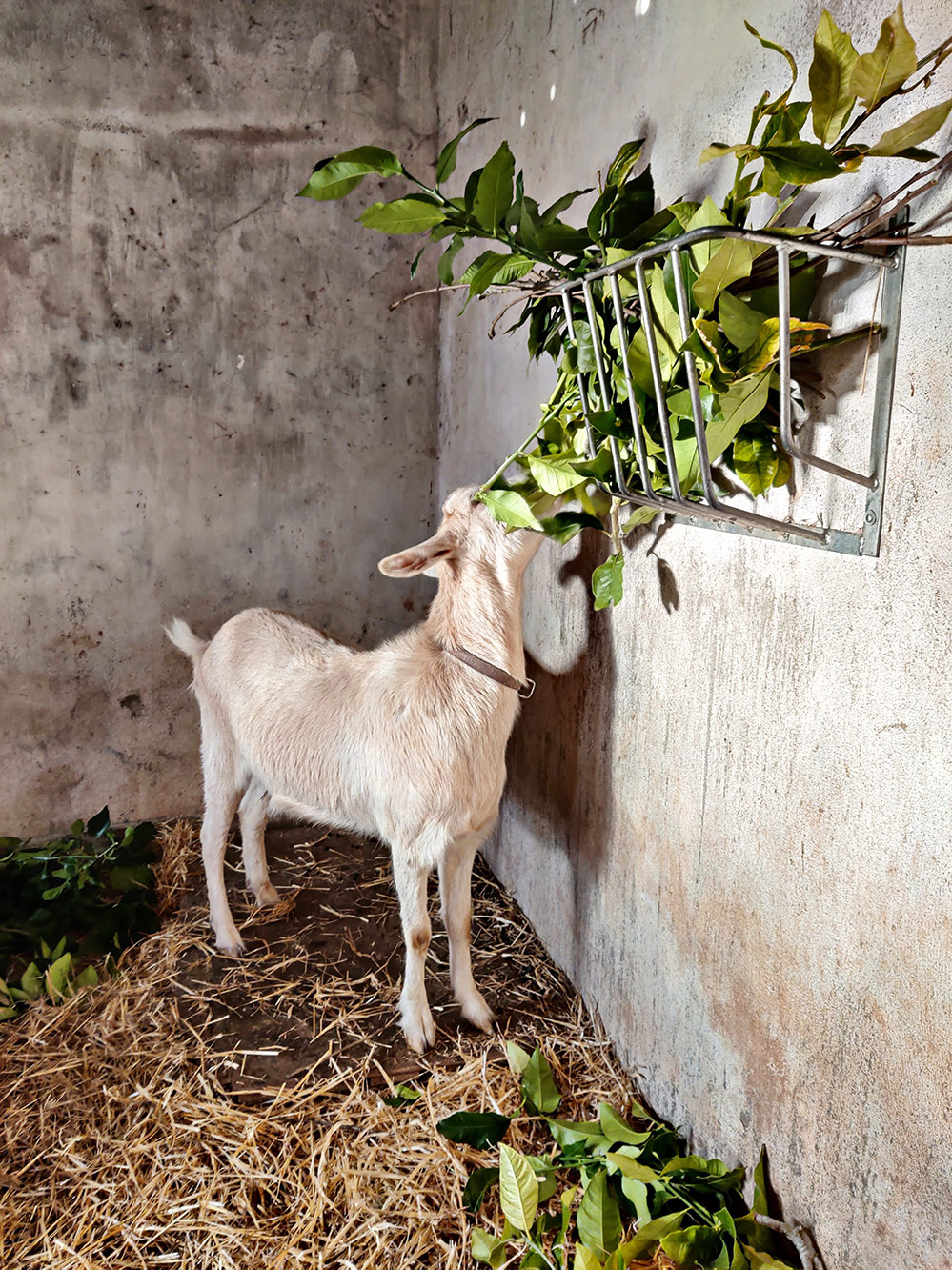 Als de hele dag buiten hebben staan grazen, komen ze met bolle buiken de stal in. Daar vallen ze meteen aan op de citroentakken, alsof ze uitgehongerd zijn.