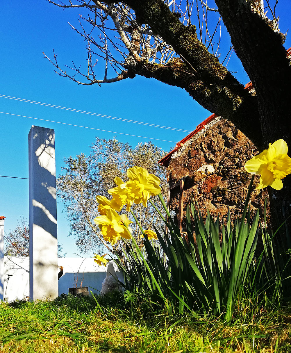 De verandering in het weer heeft nog steeds niet toegeslagen. We zijn daar een beetje tweeslachtig over. Het is lekker om een beetje in de zon bezig te zijn en de warmte van de zon te voelen. Aan de andere kant is het veel te droog en gaat Portugal problemen krijgen met de watervoorraad. Vooralsnog genieten we van het mooie weer, het lijkt of het voorjaar al is aangebroken. Onder de perenboom hebben we aan het eind van de zomer narcissenbollen in de grond gezet en die beginnen nu tot bloei te komen.
