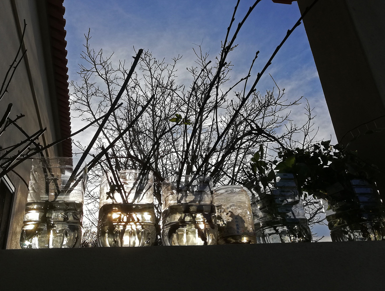 Een paar dagen geleden hebben we de perzik gemarcotteerd. Dat prachtige nieuwe woord. De rest van de perzik is gesnoeid en dan blijven een paar prachtige takken over. De moederboom is ziek en gaat het waarschijnlijk niet redden, dus er moet voor nakomelingen gezorgd worden. Marcotteren is één manier, maar misschien dat een paar taken in het water zetten ook wel lukt. Eigenlijk zijn het dan geen nakomelingen, maar klonen, maar ach.