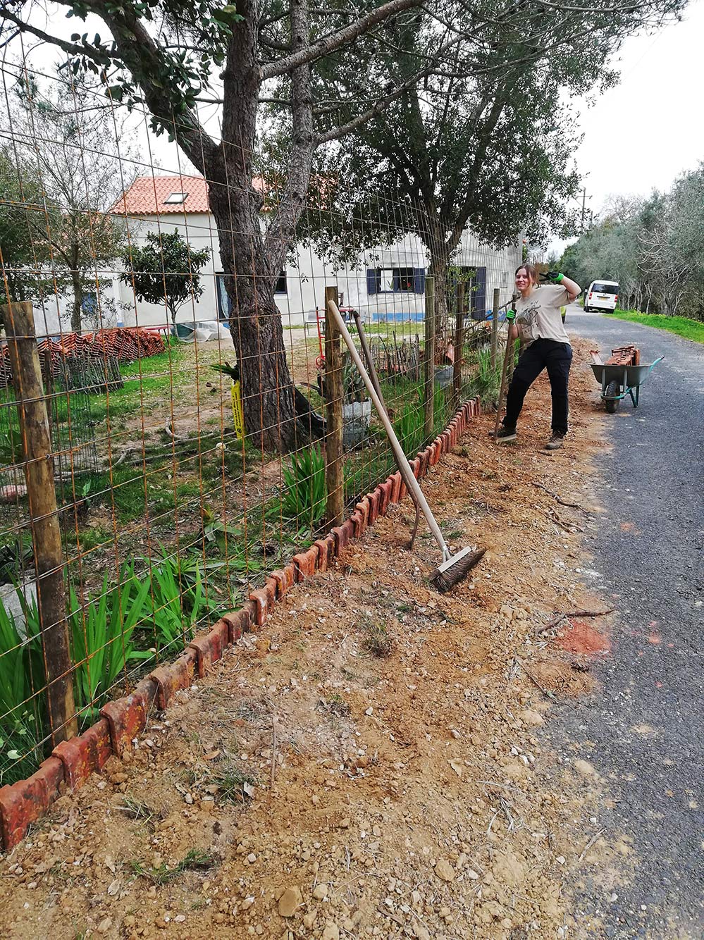 Het terrein van ons ligt een stuk lager dan de weg ernaast. Niet overal, maar op sommige stukken scheelt het wel bijna dertig centimeter. De gaten in het nieuwe hek zijn een stuk groter dan die van het oude. Daarom doen we pannen in de grond om het zand en de steentjes van de weg aan die kant te houden. De pannen komen van het dak van het oude huis. Prachtige manier van hergebruik. Het ziet er ook wel decoratief uit. Het is een hoop werk, maar we hebben nu Camille die ons helpt en dan gaat het lekker snel. Het is een stuk van een meter of veertig, dat betekent dat we een pannenrij hebben van een stuk of tweehonderd pannen. We hadden een bewolkte dag vandaag, de eerste in vier weken en dat is maar wat lekker als je een beetje staat te scheppen en te bezemen.