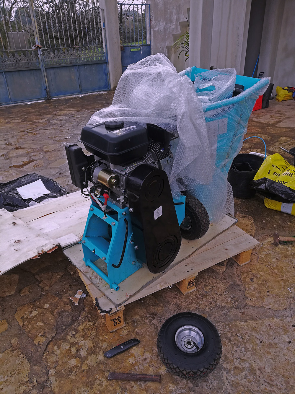 De hakselaar komt in een soort houten krat en moet nog helemaal gemonteerd worden. Morgen maar benzine kopen en olie en dan volgende week ergens aan het werk zetten.